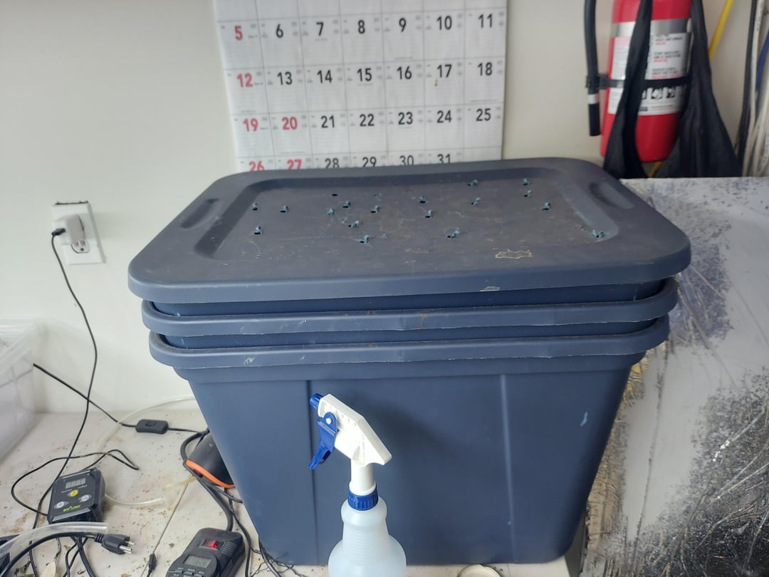 Ich habe 16 LED-Lampen, die zwischen 30 und 40 $ pro 4er-Packung (160 i$h) kosten, eine Zehnerpackung Mylar-Rettungsdecken (10 $) und einen oszillierenden Ventilator (15 $) … außerdem ein paar klappbare Picknicktische aus Kunststoff, die vielleicht irgendwie von einer Baustelle in meinen Keller gewandert sind. -Übrigens gibt es auch einen DIY-Wurmkompostbehälter. Jeder Wurm dort heißt James, also ist es nicht unangenehm, wenn wir uns sehen.