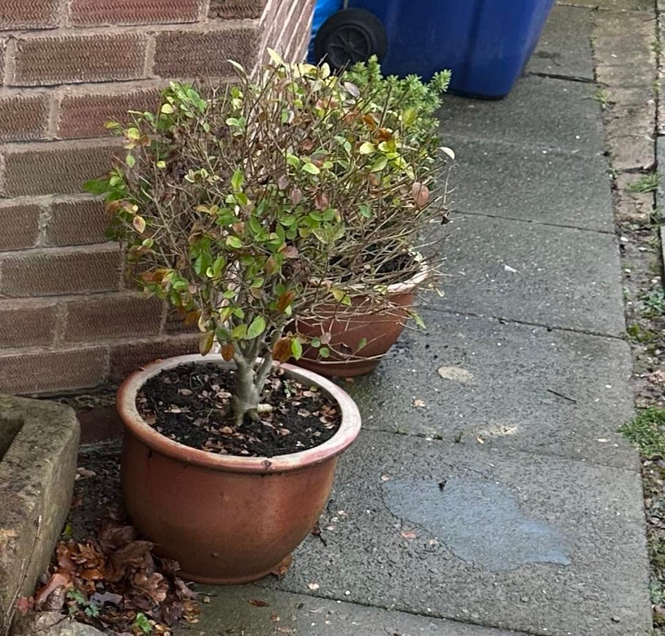 3. one seems ok and the other may have had a visit from the box tree moth. They can attack and strip whole bushes. Expect around 3 visits per year!