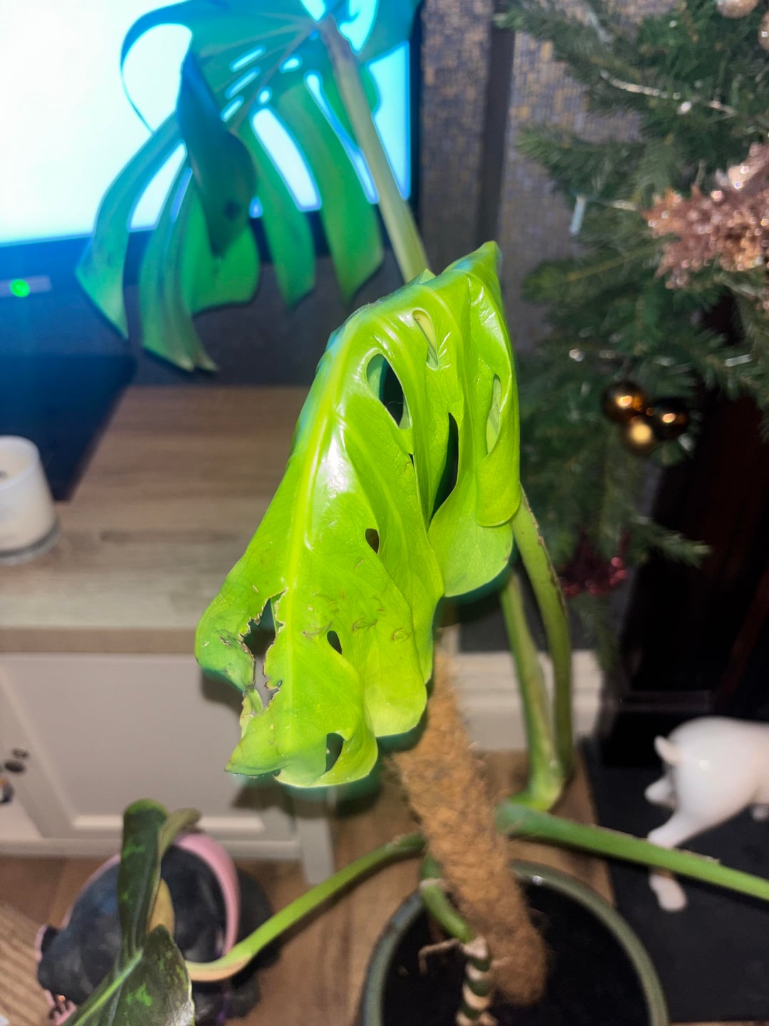 Das andere schlaffe Blatt blieb beim Wachsen in der Moosstange stecken und sie ist seit dem Umtopfen schwach