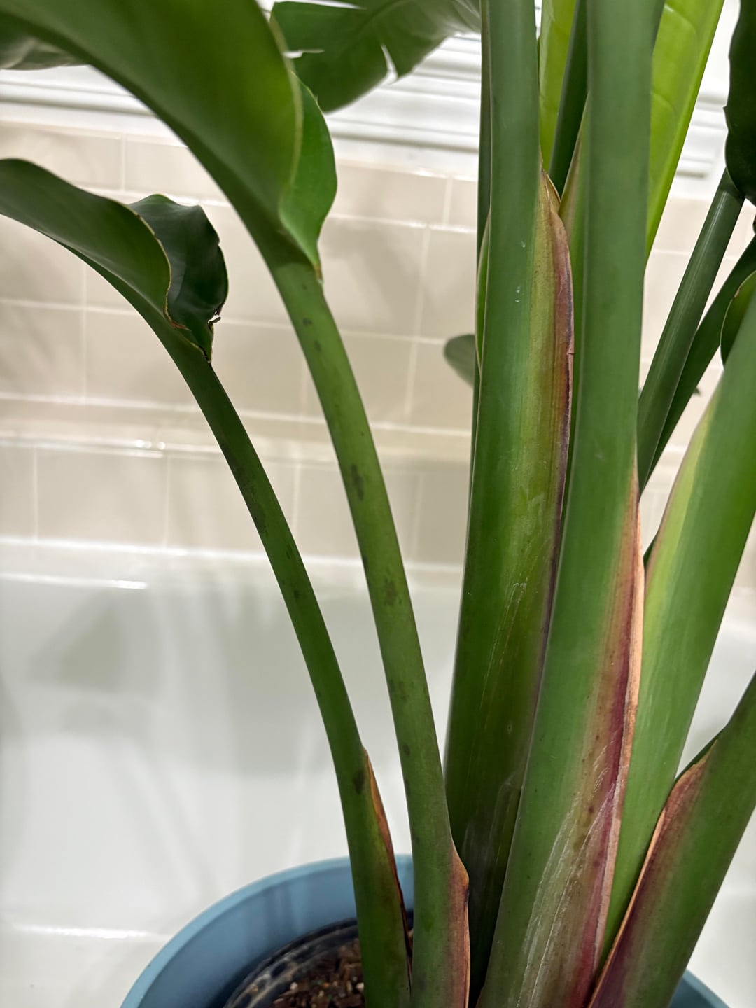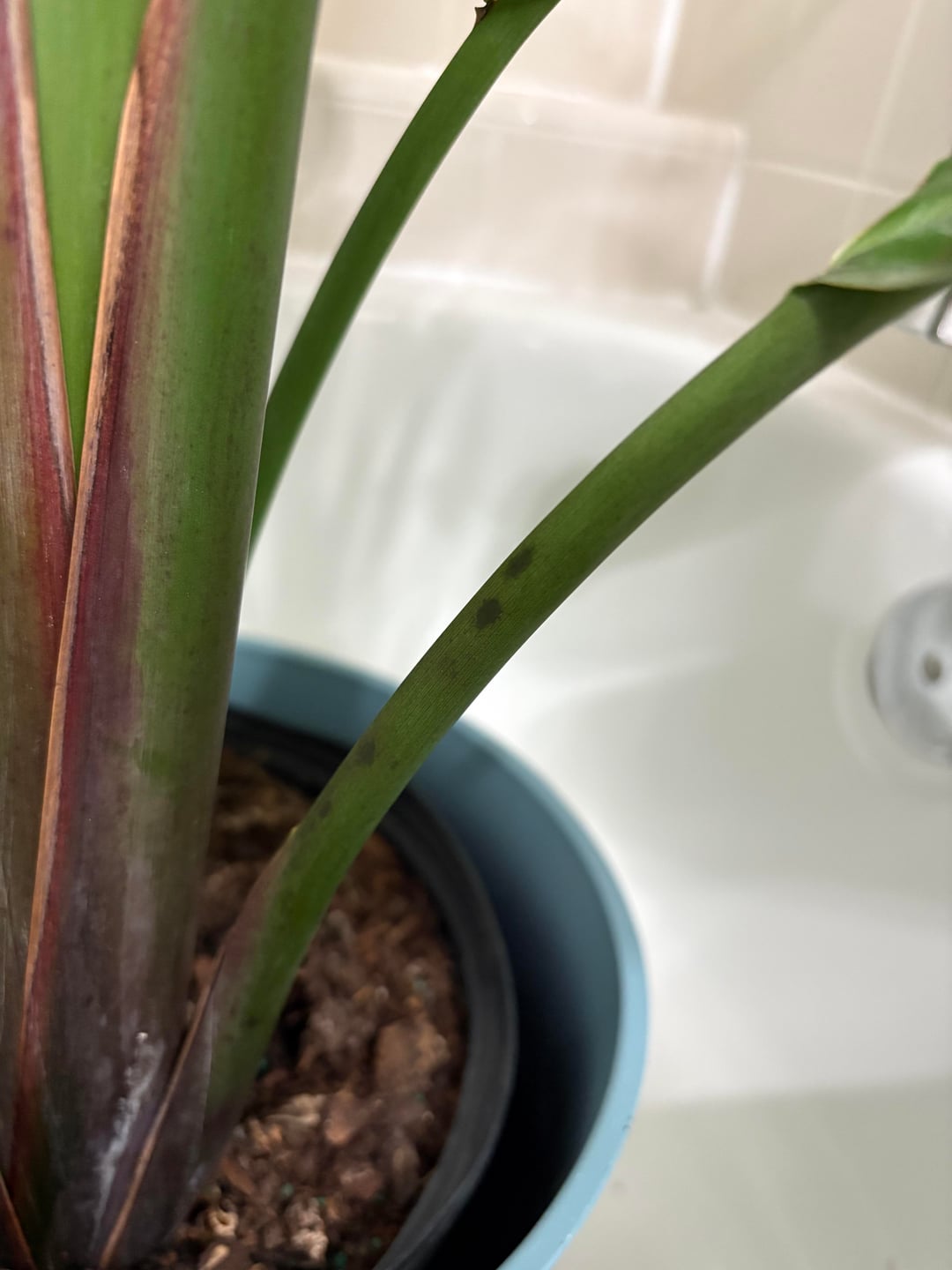 Dies ist mein erster BOP, daher bin ich nicht zu 100 % mit dem zufrieden, was ich erwarten kann. Mir ist aufgefallen, dass die Blätter etwas hängender sind als bei der ersten Pflanze, und ich habe diese schwarzen Flecken bemerkt. Ist das ein Zeichen von Wurzelfäule oder vielleicht zu viel Sonne? Ich habe sie im Moment in meinem Badezimmer, das ein großes Fenster hat und viel Morgensonne bekommt