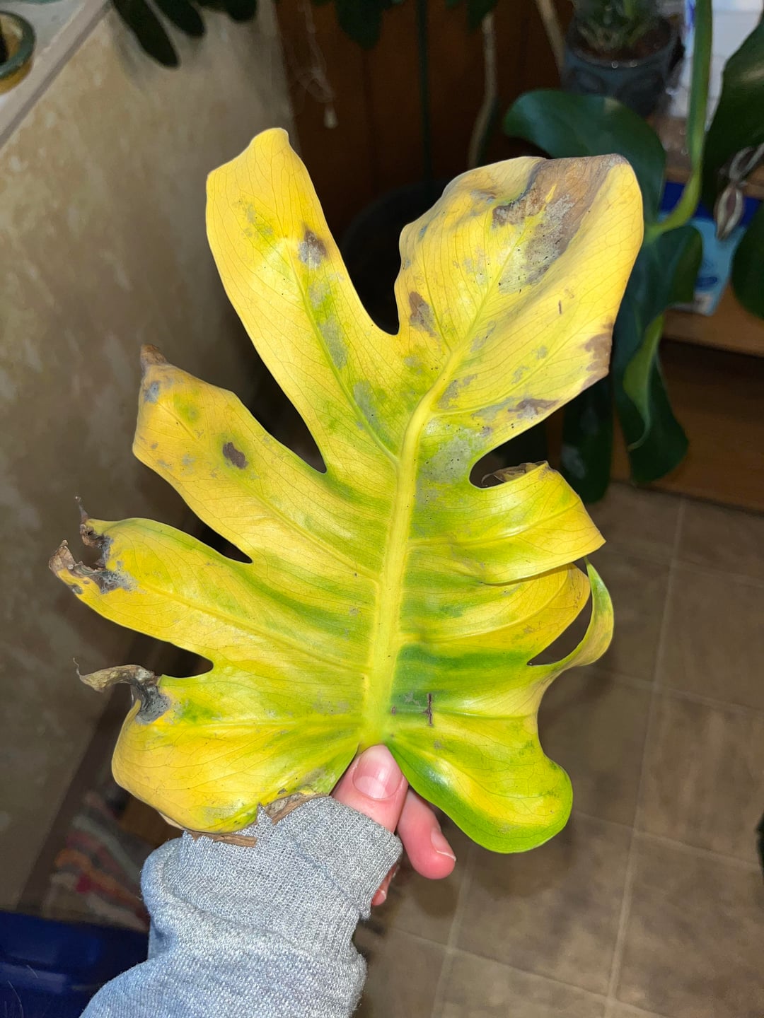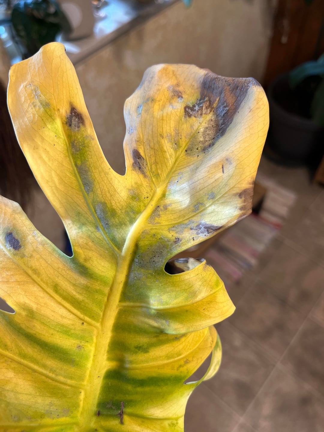 Hallo! Ich bin mir nicht sicher, was mit meinem Monstera-Blatt passiert ist. Es hat kleine schwarze Flecken auf der Oberfläche, die sich wie Schmutz anfühlen. Es ist das einzige Blatt, das so aussieht. Könnte mir bitte jemand helfen!