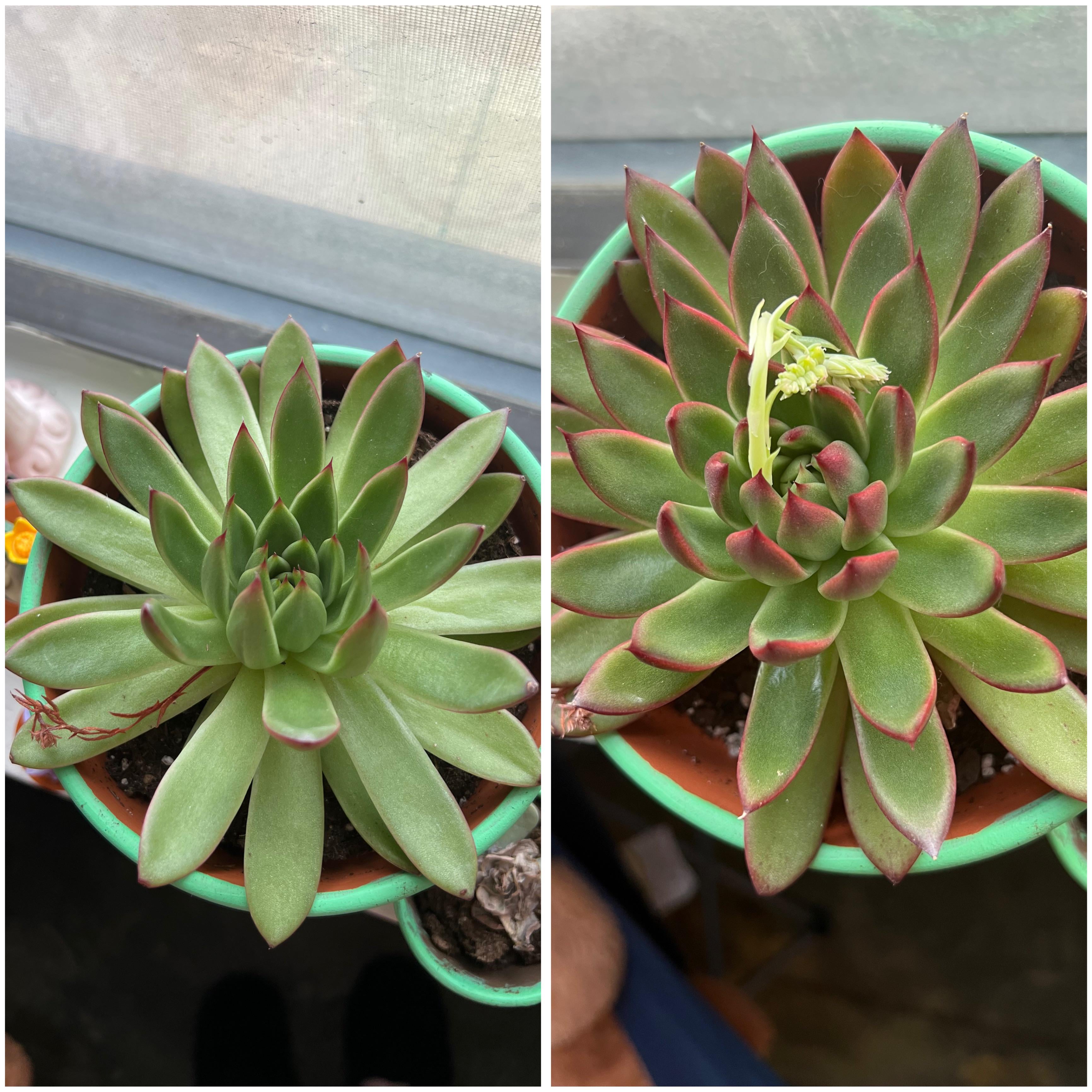 Ich habe diese Sukkulente letztes Jahr bekommen. Ich weiß nicht, um welche Art es sich handelt, aber aus der Mitte wächst eine Art Stiel oder etwas Ähnliches. Das erste Bild zeigt, wie die Sukkulente aussah, als ich sie im April letzten Jahres kaufte, und das zweite Bild zeigt das neue Wachstum. Es hat erst vor 7 Tagen ganz klein angefangen zu sprießen und ist schon so lang. Ich bin mir sicher, dass es sich wahrscheinlich nur um einen Stamm handelt, aber ich wollte hier nur für den Fall fragen, dass kein Anlass zur Sorge besteht. Vielen Dank im Voraus!