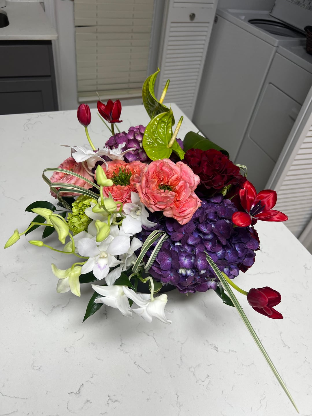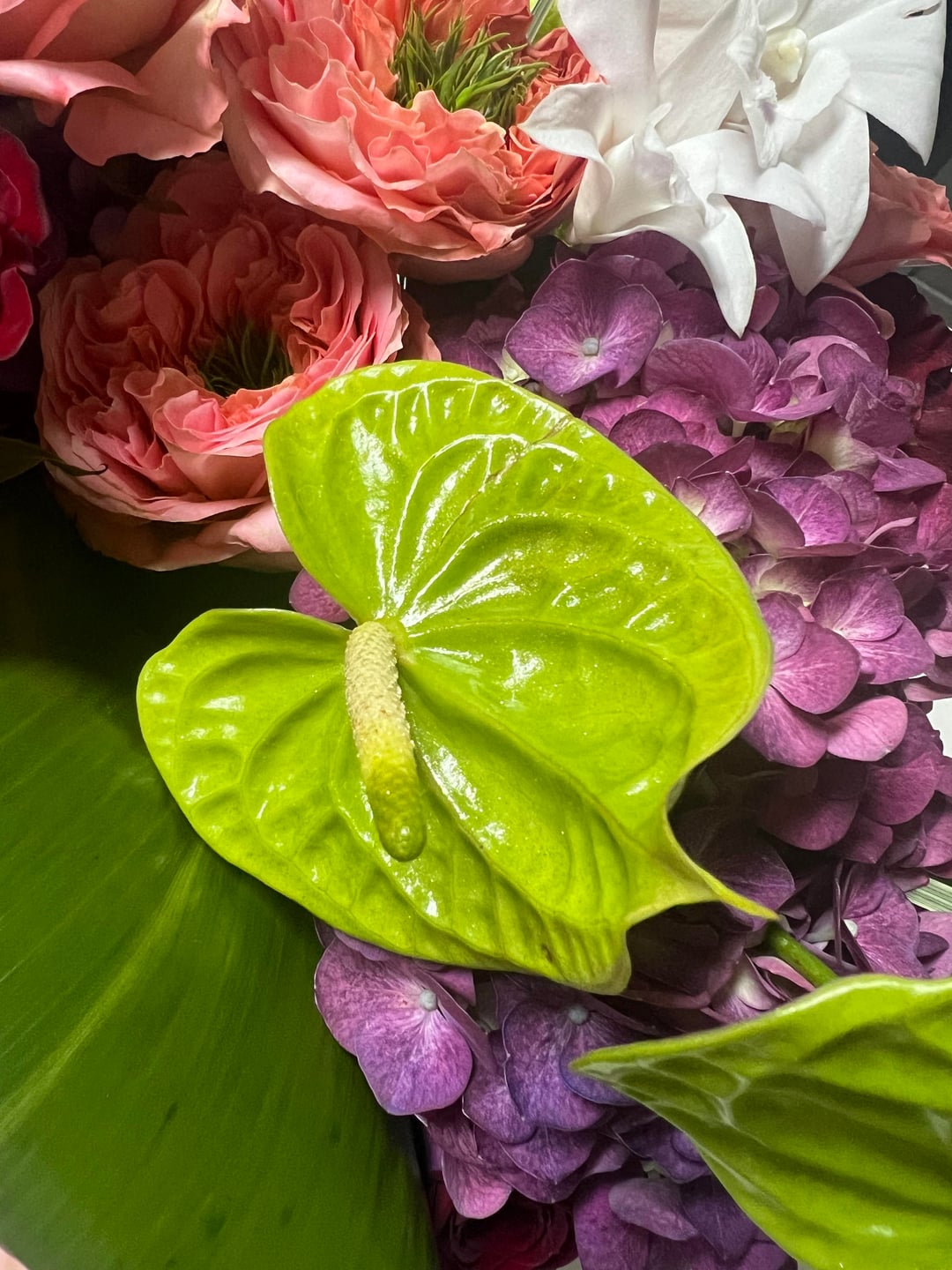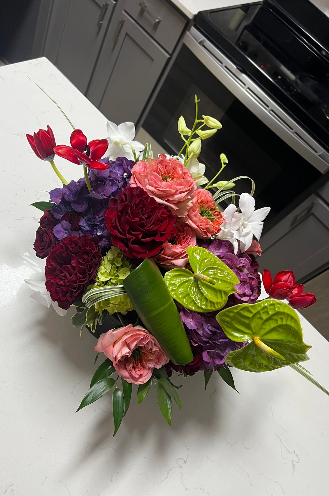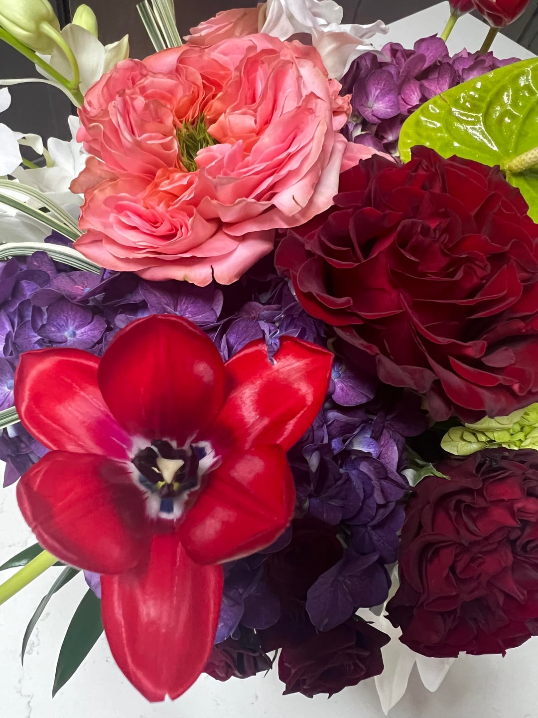 Hortensien, Tulpen, Herzrosen, rosa Ausdrucksrosen, Anthurien, Sprührosen oder Orchideen, Liliengras 🙂