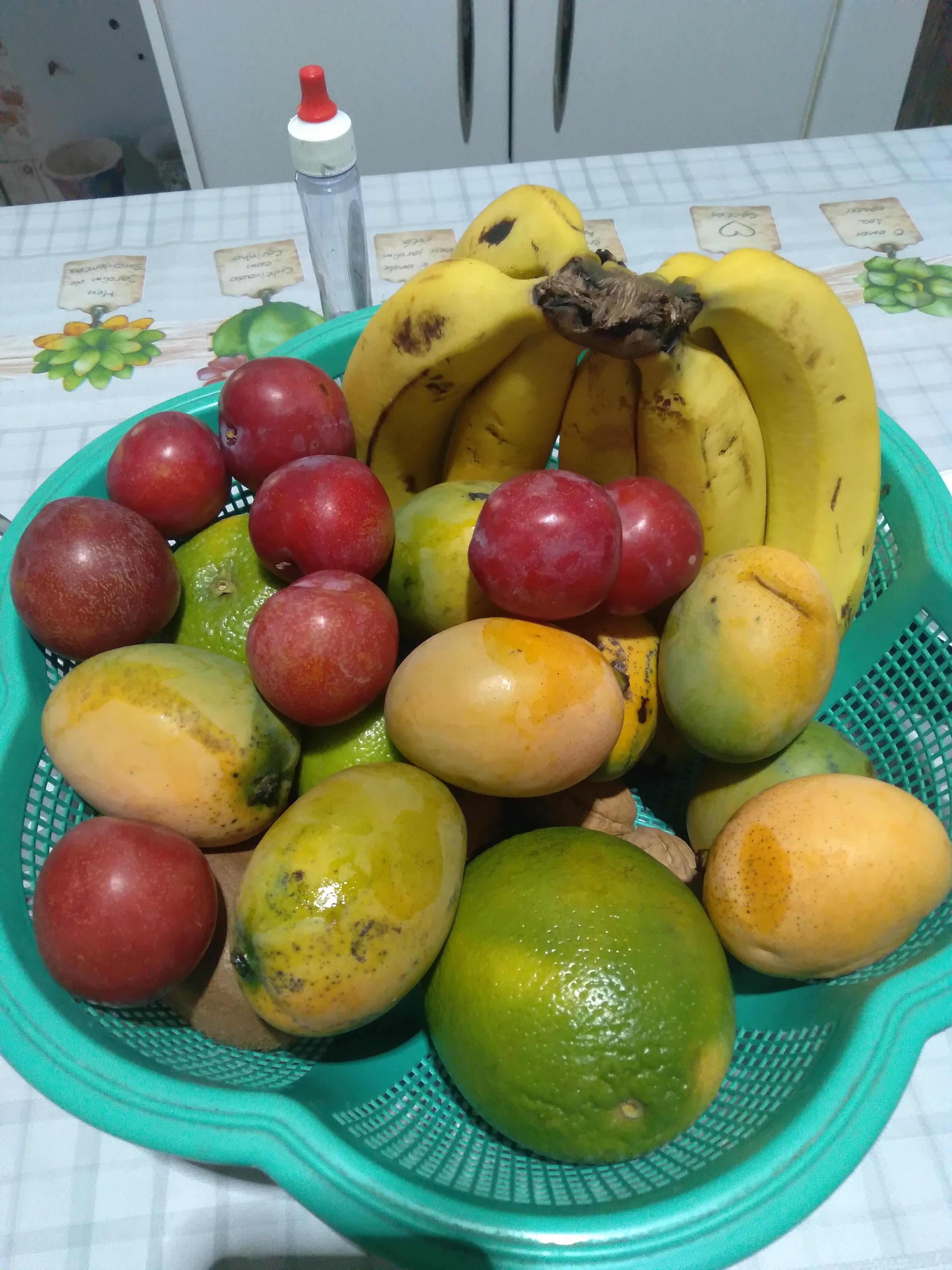 Grünliches Orange: Mangos, Rot: Pflaumen, Grün: Grüne Orangen und Limetten, Gelb: Bananen, Hellbraun: Walnüsse, Braun: Kiwi Von: Usual-Cup8379