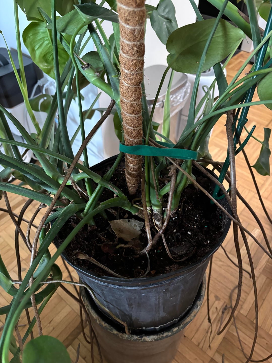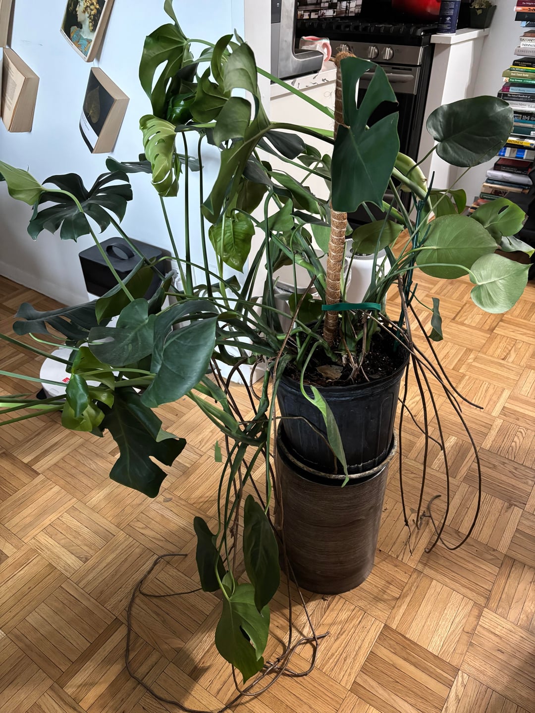 Hallo! Ich habe eine große Monstera-Pflanze, der wir nicht wirklich viel Aufmerksamkeit geschenkt haben, damit sie gerade wächst, und wahrscheinlich haben wir das Umtopfen schon zu lange aufgeschoben. Wir denken endlich darüber nach, es umzutopfen, damit es im Hinblick auf die Einrichtung von Stützen usw. besser zu handhaben ist.