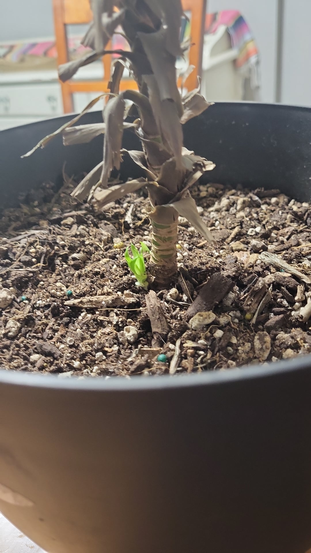 Diese Pflanze habe ich schon seit Jahren, sie beginnt langsam, Blätter zu verlieren, und ich habe sie gerade abgeschnitten und immer noch gegossen. Heute habe ich ein kleines Baby bemerkt! Muss ich die Oberseite abschneiden, damit das Baby besser wachsen kann?