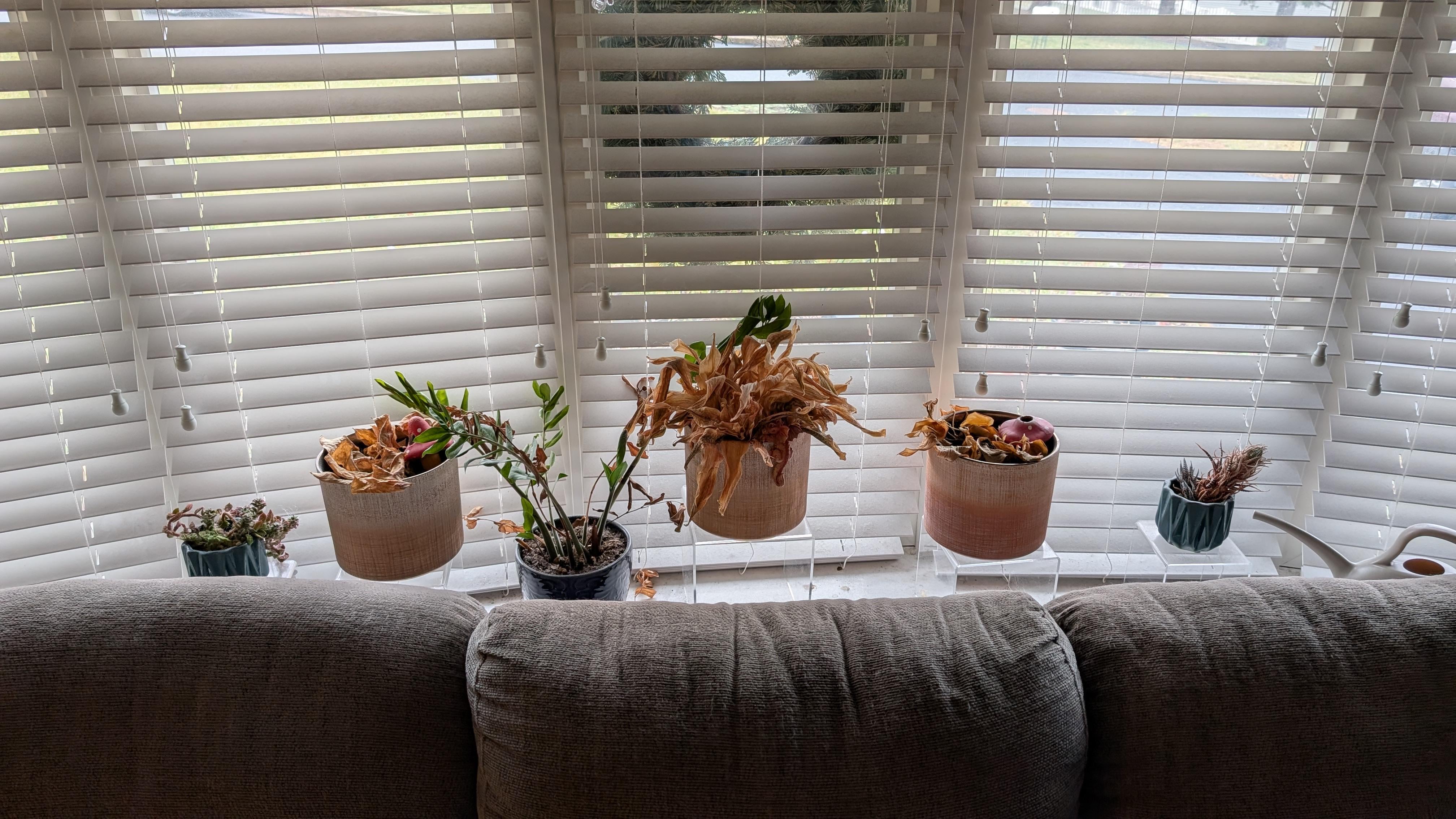 Hallo, das Foto der Pflanzen muss unbedingt ersetzt werden. Ich bin mir nur nicht sicher, was hier gut wachsen kann? Es handelt sich um ein Erkerfenster im Südosten, aber auch um die Vorderseite unseres Hauses mit Blick auf die belebte Straße, sodass die Jalousien aus Gründen der Privatsphäre sozusagen nach unten zeigen. Ich hatte wirklich kein Glück, hier irgendetwas am Leben zu erhalten. Die Pflanzen auf dem Foto werden ganz offensichtlich vernachlässigt, sodass ich genau weiß, warum sie tot sind oder sterben. Ich lebe im Nordosten der USA und in diesem Wohnzimmer ist es im Winter (jetzt) sehr trocken (26 %) und im Sommer an Tagen mit hoher Luftfeuchtigkeit 47 %. Wir haben eine permanente Markise über dem Erkerfenster, sodass es nicht den ganzen Morgen bis zum Nachmittag, wenn die Sonne hoch steht oder so, direktem Sonnenlicht ausgesetzt ist.
