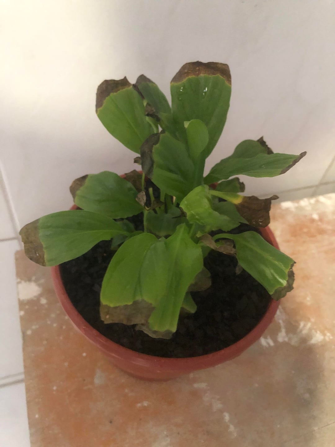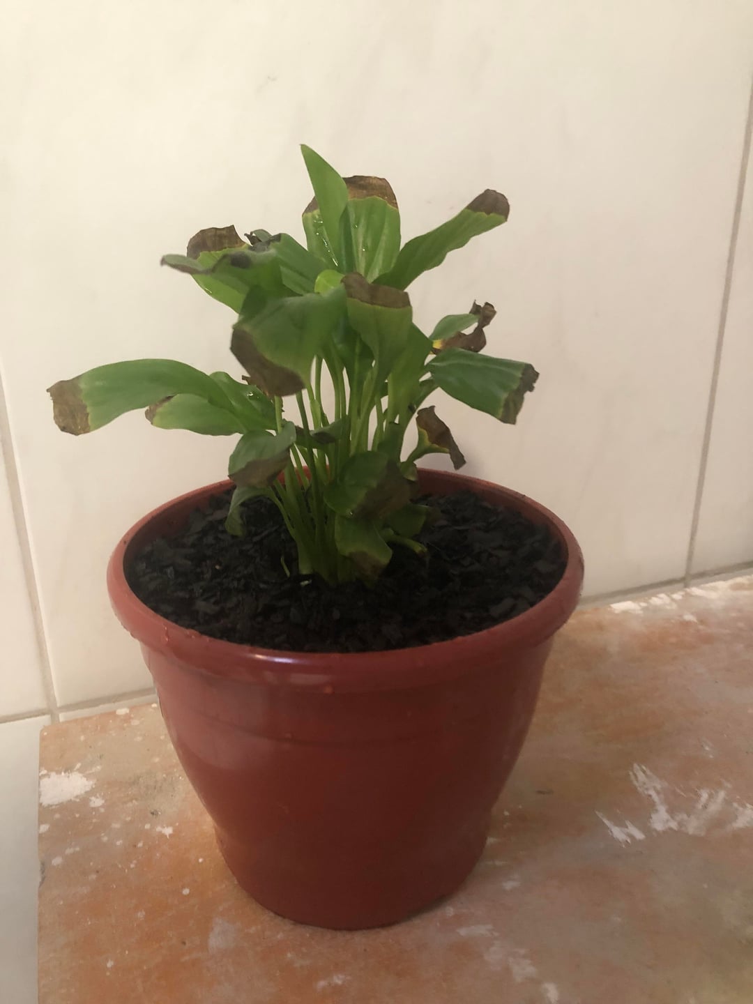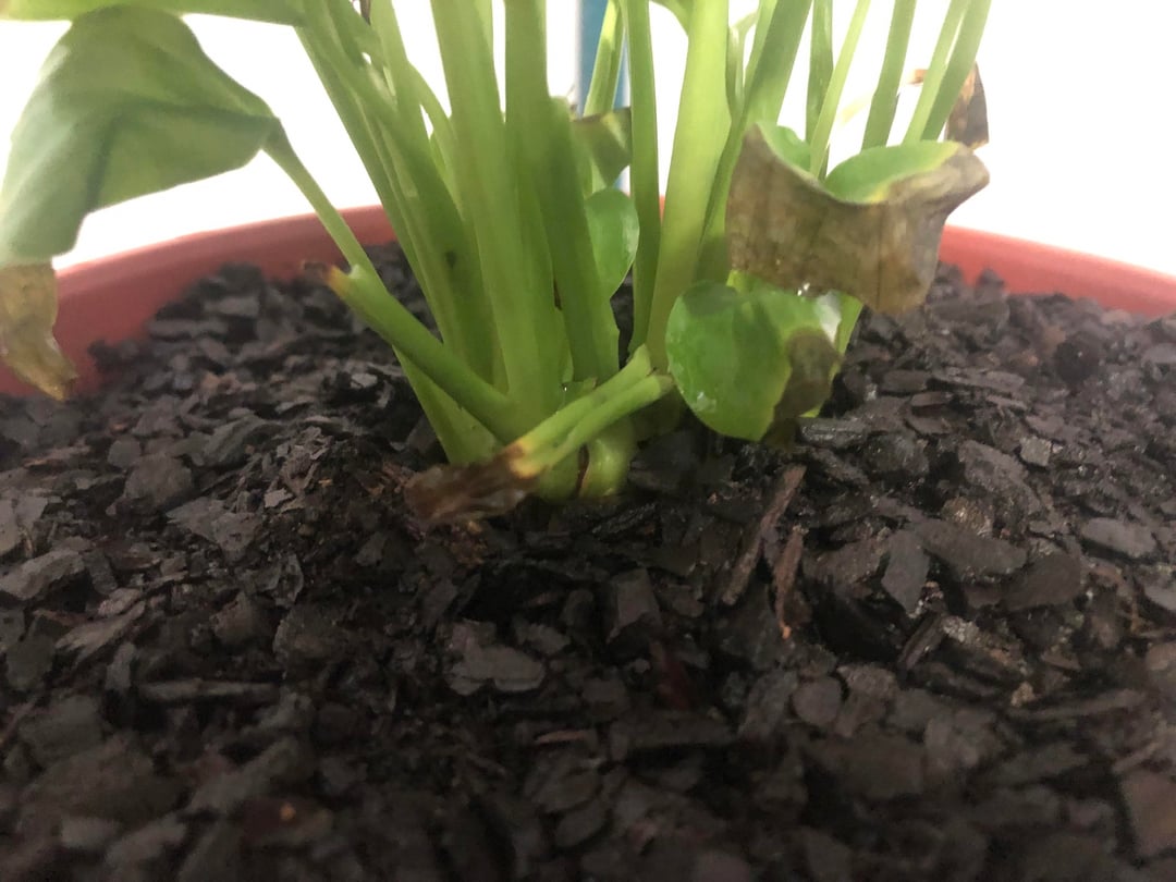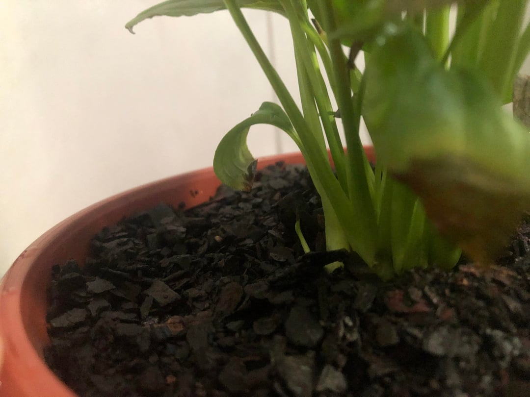 Ich habe diese Friedenslilie seit etwa vier Monaten. Als es ankam, war es wunderschön und blühte, aber nach und nach entwickelten sich diese verbrannten Blätter, bis auch alle Blüten an den Verbrennungen starben. Es war sehr traurig. Ich habe mich sehr bemüht, es zu retten; Die Wurzeln scheinen gesund zu sein, aber ich weiß nicht, was ich falsch mache. Sie befand sich in einem sehr kleinen Topf, also habe ich sie in diesen größeren umgetopft, sie mit einigen Kieselsteinen darunter, einem Baumwolltuch auf den Kieselsteinen, einer Schicht Kompost und der Pflanze oben mit mehr Kompost umgetopft (ich habe ein Foto des von einer Floristin empfohlenen Komposts beigefügt und ihre Anweisungen zum Umtopfen befolgt). Meine Friedenslilie hat die folgende Routine: