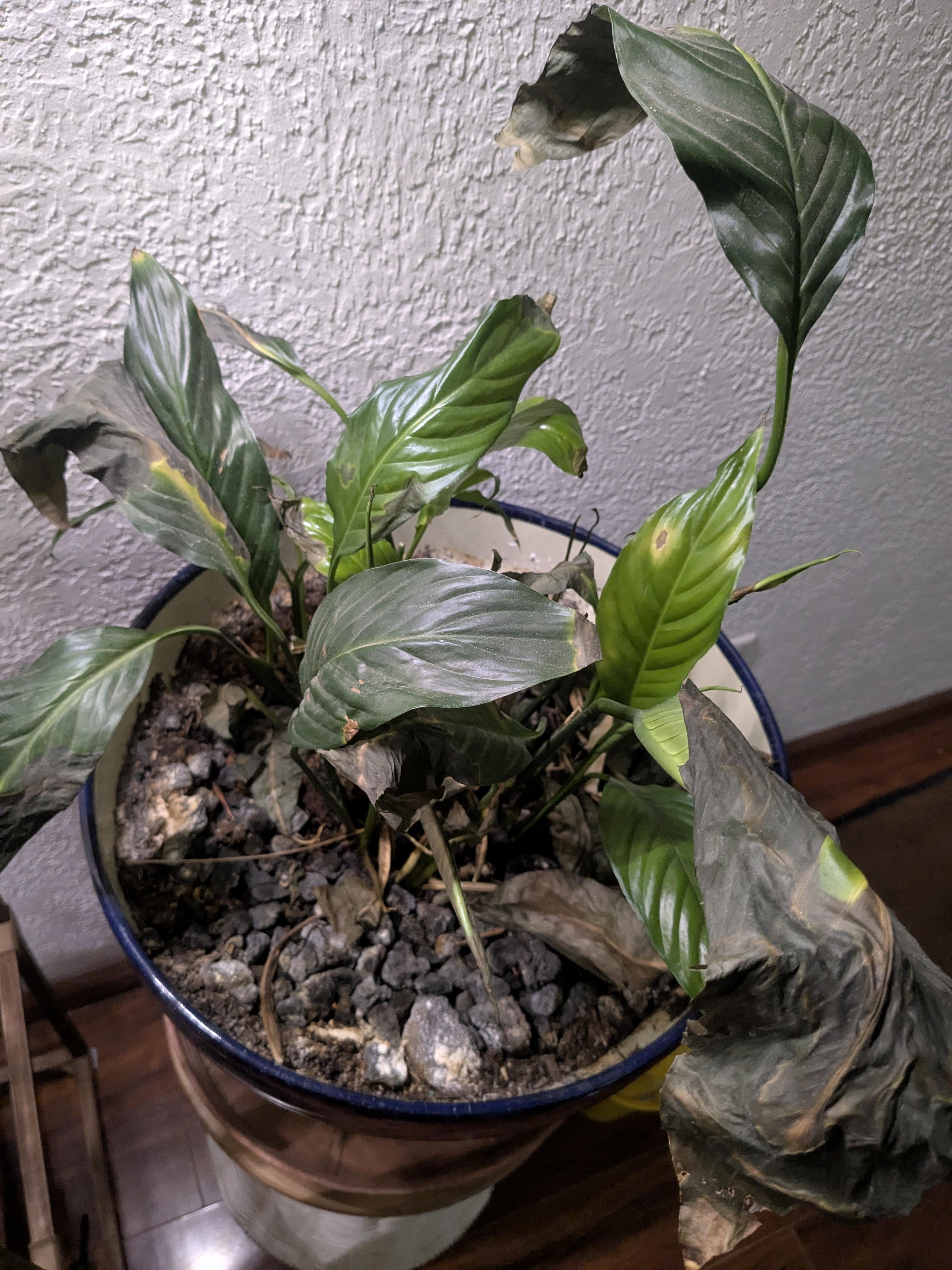 Meine Mutter hat eine Friedenslilie geschenkt bekommen. Ich bin im Allgemeinen gut mit Gartenarbeit und Indoor-Gartenarbeit in einer kontrollierten Umgebung vertraut. Bauen Sie die meisten unserer Lebensmittel das ganze Jahr über in zwei speziellen Wachstumsräumen an, aber aus irgendeinem Grund unterscheiden sich Hydrokulturen und dergleichen offenbar VIEL von Zimmerpflanzen, lol. Als es jünger war, befand es sich in einem kleineren Topf und wurde überbewässert, aber ich glaube, das habe ich behoben; Größerer Topf mit besser entwässernder Erde (Mischung aus Blumenerde und Kokosfasern, sie entwässert jetzt gut, also denke ich nicht, dass das das Problem ist. Was das Licht angeht, ist es sehr indirekt, hat ein Oberlicht und ein Westfenster in der Nähe, ordentliches indirektes Licht den größten Teil des Tages. Ich habe gelesen, dass es mehr braucht, um tatsächlich zu blühen, aber wie Sie sehen, ist das ein weit entferntes Ziel, kleine Schritte usw., ich möchte nur, dass es vorerst nicht leidet, lol 🙁