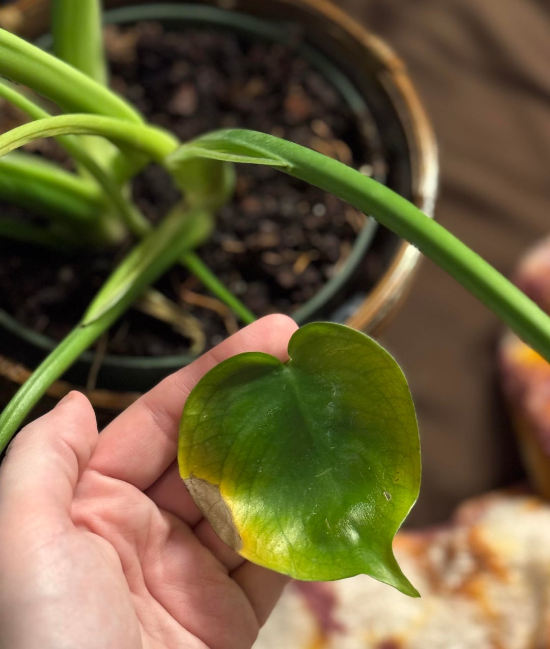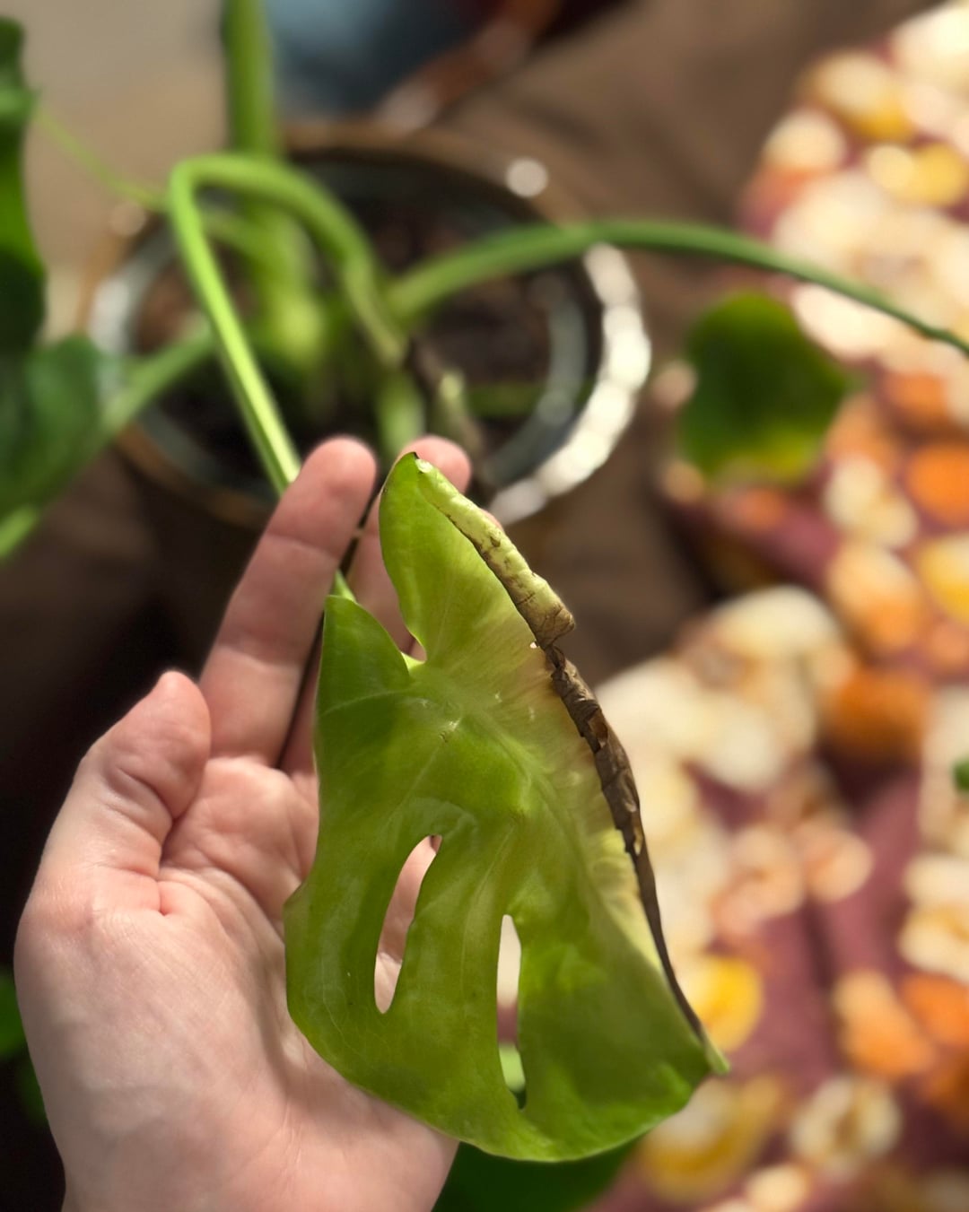 Ich habe sie erst seit November. Die Pflanze lebt in der Nähe eines Fensters und erhält ausreichend indirektes Sonnenlicht. Ich gieße es nur, wenn die Erde austrocknet, bestäube die Blätter und besprühe es gelegentlich, wenn die Luftfeuchtigkeit niedrig ist.