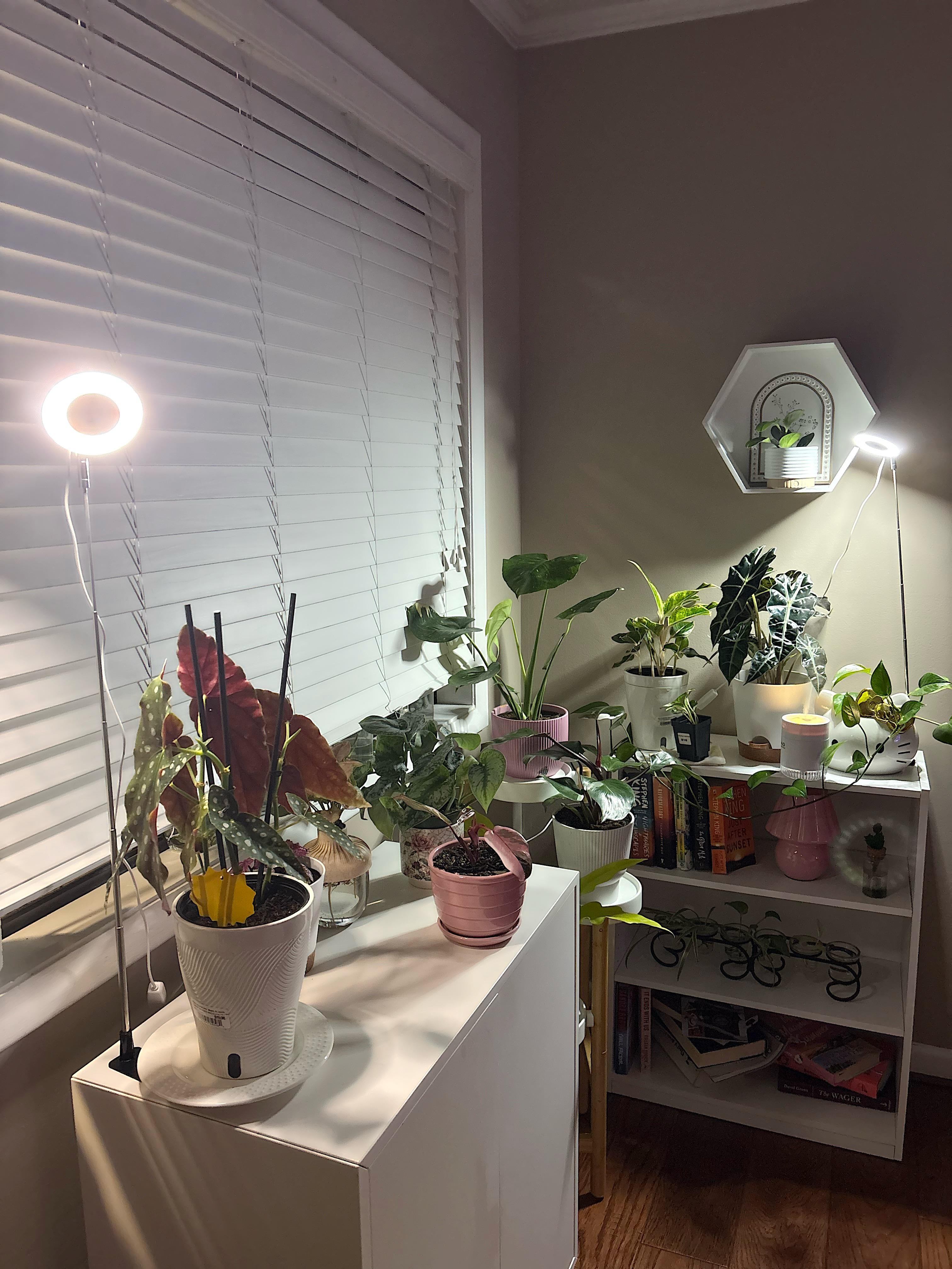 Ich habe gerade diese Wachstumslichter bekommen und aufgestellt!! Wie Sie sehen können, stehen meine Pflanzen neben einem großen Fenster, aber ich glaube, dass mein Fenster viel Licht filtert. In diesem Raum kann es manchmal immer noch ziemlich dunkel sein, und an bewölkten Tagen befürchte ich, dass sie überhaupt nicht genug Licht bekommen. Ist das mit den Wachstumslampen zu viel Licht für meine Pflanzen? Ich schalte sie nachts aus und nehme sie vielleicht für den Sommer ab, aber für diese dunkleren und düstereren Wintertage denken wir, dass diese Einrichtung in Ordnung ist??