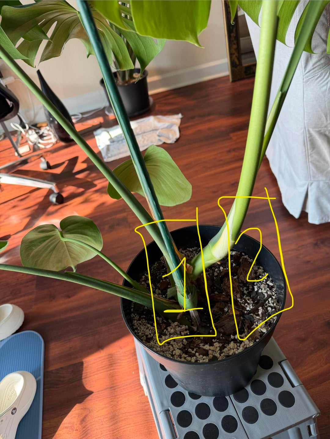 Ich habe ein Monstera, das eine neue Unterstützung braucht, bin mir aber nicht sicher, wie ich es strukturieren soll. Ich habe es damals ursprünglich auf der Rückseite der Pflanze platziert, aber es hat sich kürzlich verzweigt und zwei neue Blätter gebildet, sodass es scheinbar eine neue Rückseite hat. Ich habe darüber nachgedacht, ein Zedernbrett als Stütze zu verwenden, bin mir aber nicht sicher, wo ich es platzieren soll. Im zweiten Bild habe ich zwei Stellen eingezeichnet, 1 und 2, als mögliche Stellen für die Planke. Oder sollte ich mir einfach eines besorgen, das groß genug ist, dass beide hineinpassen?