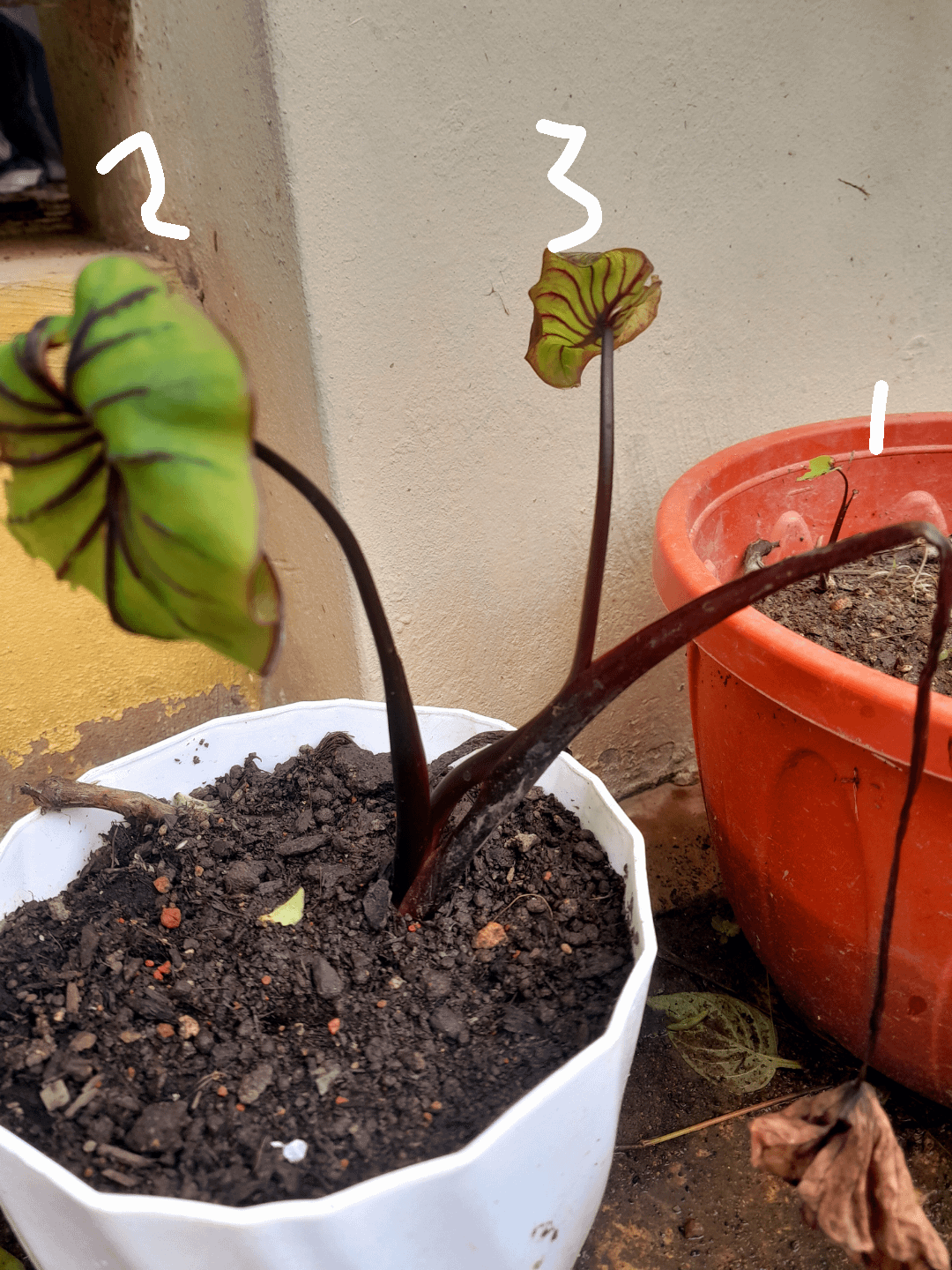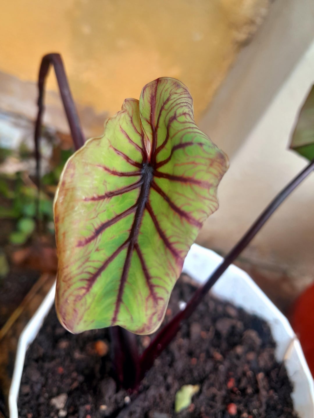 Das ist die Maske meines Colocasia-Pharaos. Normalerweise wächst aus der Spitzenknospe des Stängels ein einzelnes neues Blatt hervor. Allerdings ist bei dieser Pflanze aus dem alten Blatt ein weiterer Stamm gewachsen. Nach meiner kurzen Recherche bei Google wird dies durch Achselknospen unter der apikalen Knospe verursacht. Keine Ahnung, warum es beschlossen hat, ein weiteres Blatt herauswachsen zu lassen. Vielleicht hat es gespürt, dass das zweite Blatt von Raupen gefressen wird?