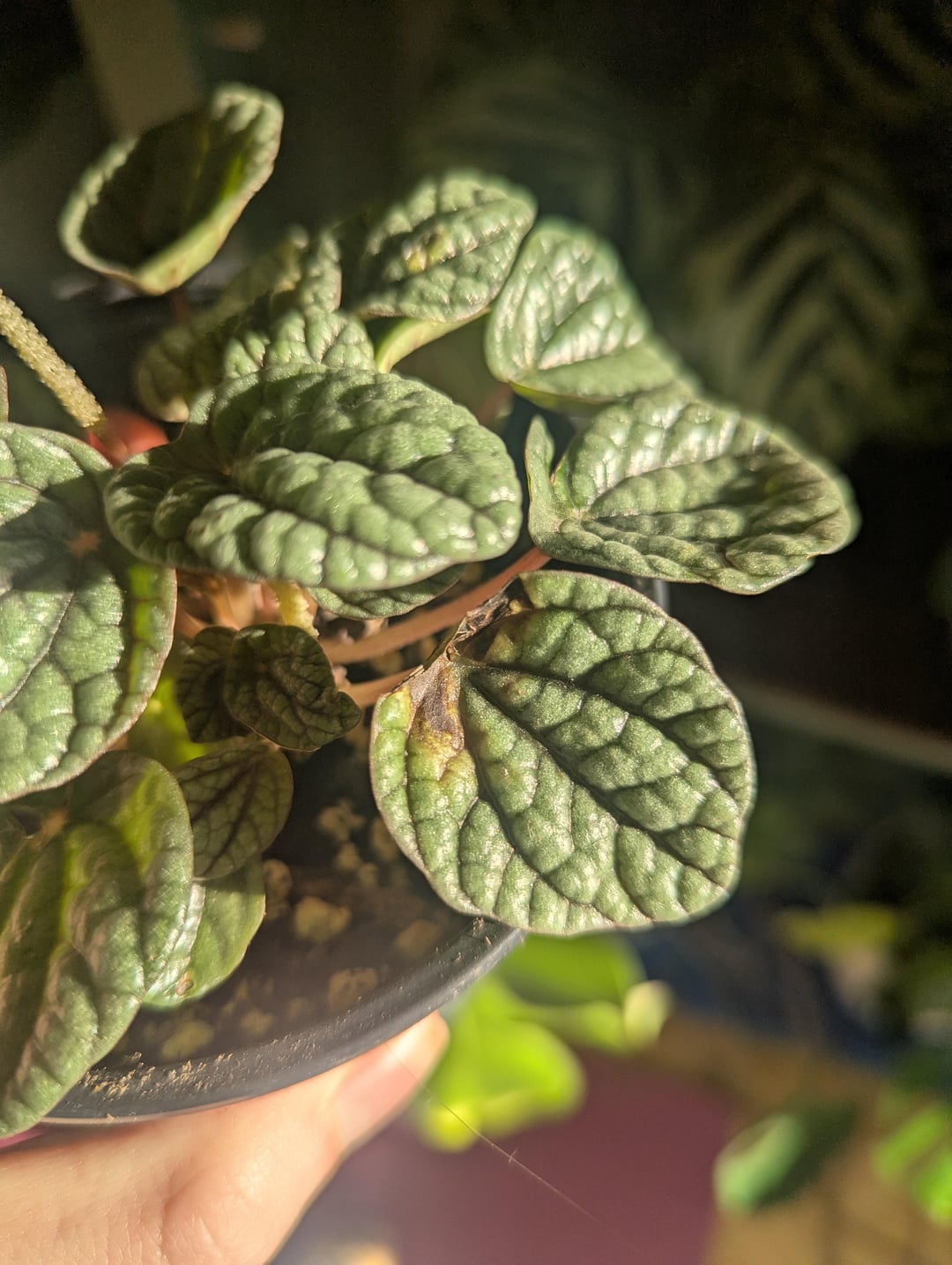 Ich weiß nicht, was passiert. Sie spendet 8 Stunden Licht pro Tag und hilft mit einer Wachstumslampe, ca. 1 m entfernt, wahrscheinlich nicht so viel. Der Boden ist fast trocken. Ich habe sie vor etwa 2 Wochen angezeigt. Bekommt eine halbe Dosis Dünger. Ich vermute nur, dass es sich für mich so anfühlt, als ob es an Überbewässerung, Unterbewässerung, Dünger oder zu viel Sonne liegen könnte? Keine Ahnung, ich bin sehr verwirrt.