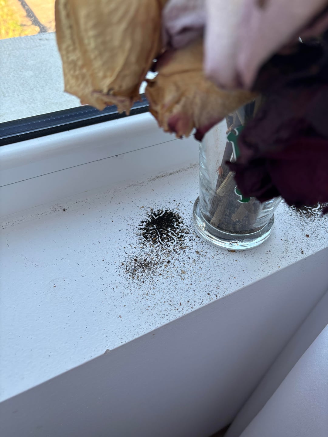 Ich habe diese Rosen seit Monaten, sie wurden mit viel Haarspray bestrichen und liegen vergessen auf meiner Fensterbank. Hin und wieder schaue ich sie mir an und sehe überall dieses schwarze Durcheinander. Ist es Schimmel? Ist es Pollen? Die Samen von innen vielleicht? Verschlechtern sich die Rosen? Ich habe so viele Fragen…