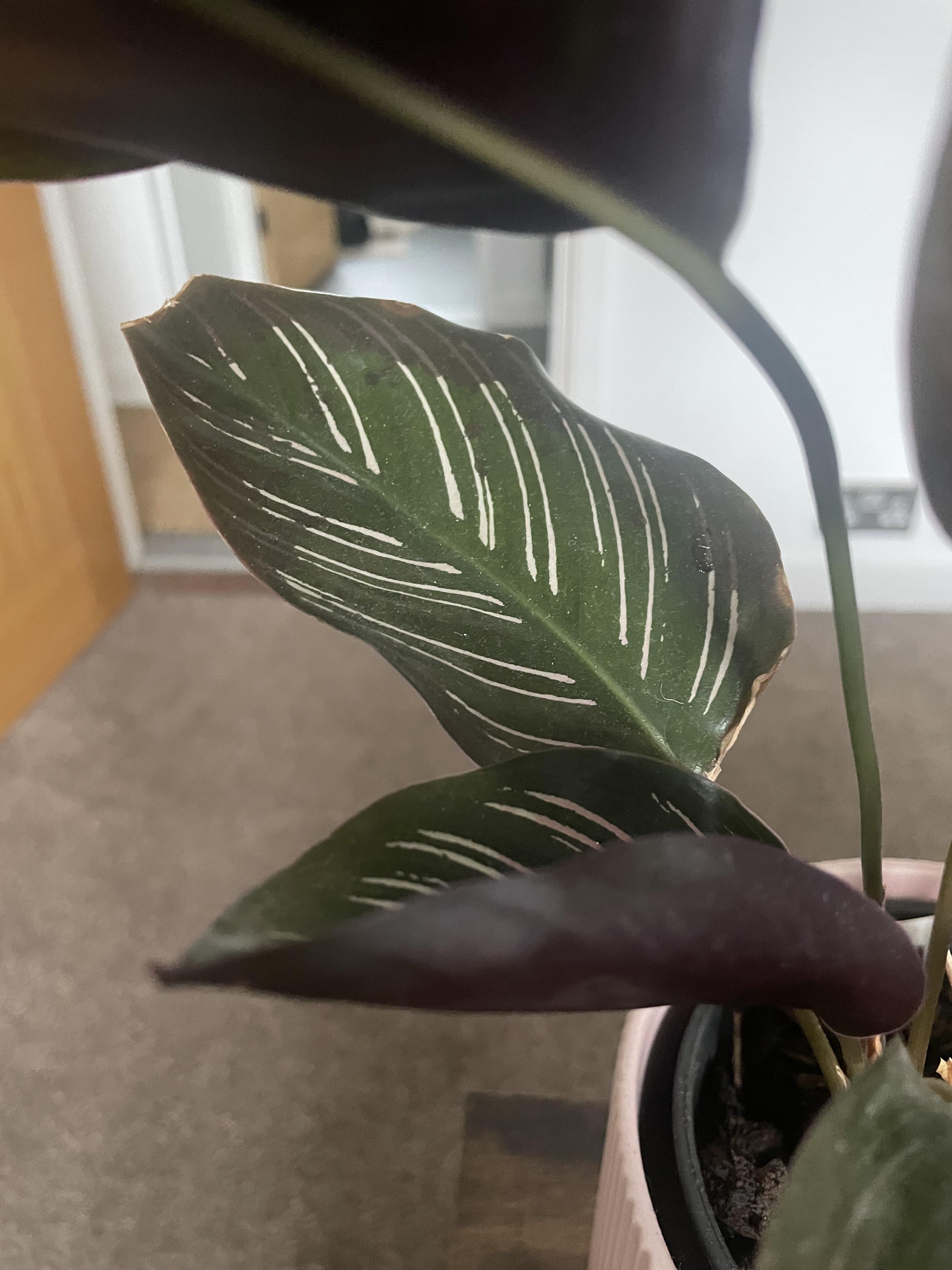 Meine Calathea hat vor kurzem begonnen, dunkler zu werden. Das ist nicht die übliche Bräunung der Ränder, aber auf den Blättern selbst breitet sich diese seltsame Dunkelheit aus. Ich habe vor kurzem damit begonnen, ihnen gefiltertes Wasser zu geben (was ich gehört habe, dass Sie dazu bestimmt sind), aber jetzt ist das passiert