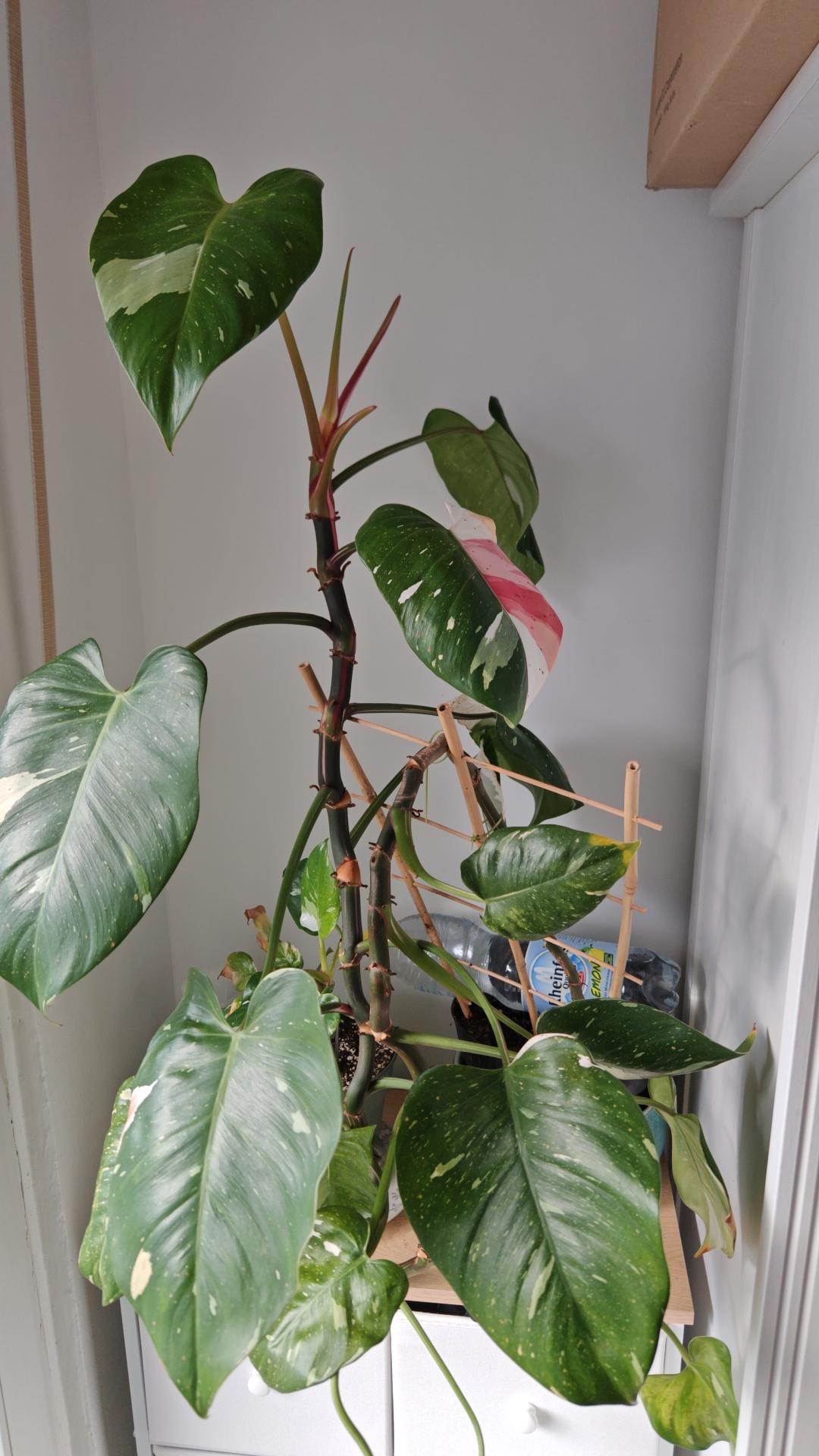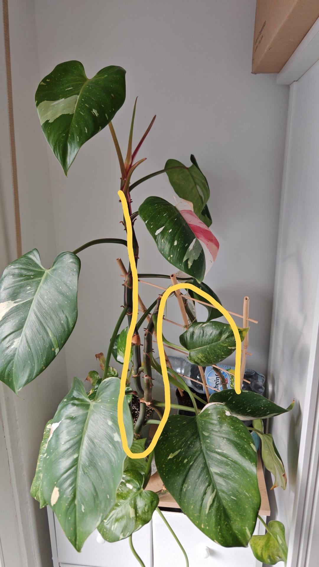 Ich habe diese schöne Pflanze bekommen, leider hatte sie vor einer Weile Schädlinge und hat die meisten der bodennahen Blätter verloren. Sie hat eine lustige Wuchsform (im 2. Bild eingezeichnet). So langsam bekommt sie aber Übergewicht auf einer Seite, weswegen da auch schon die Flasche als Gegengewicht auf dem Topf liegt.