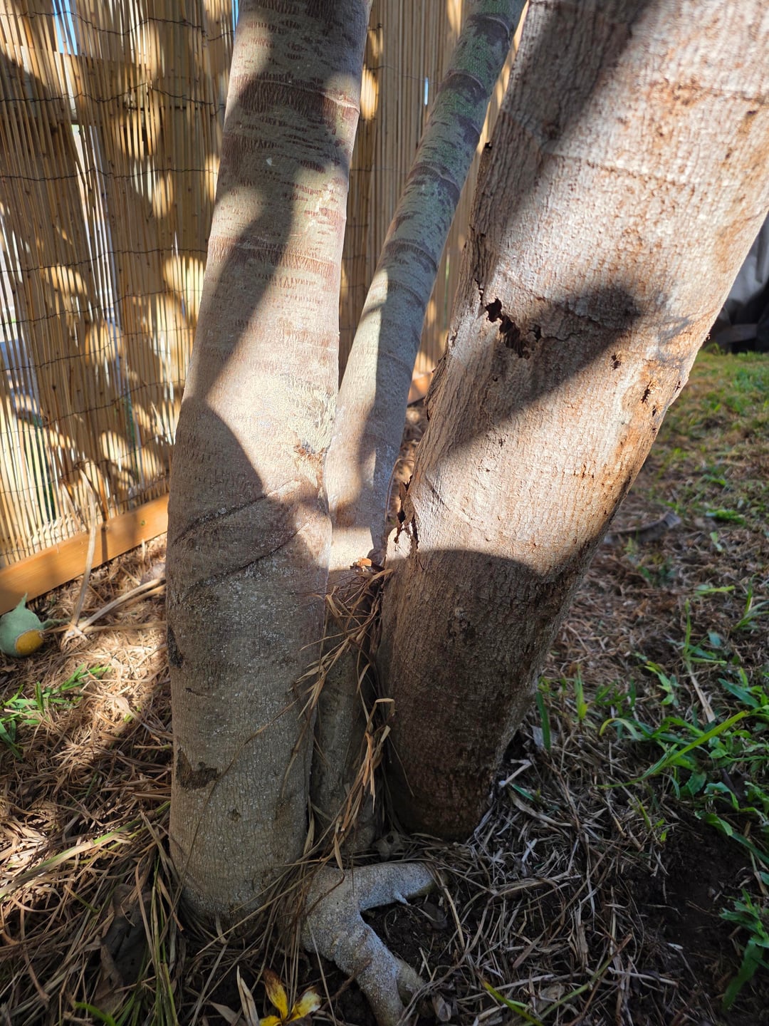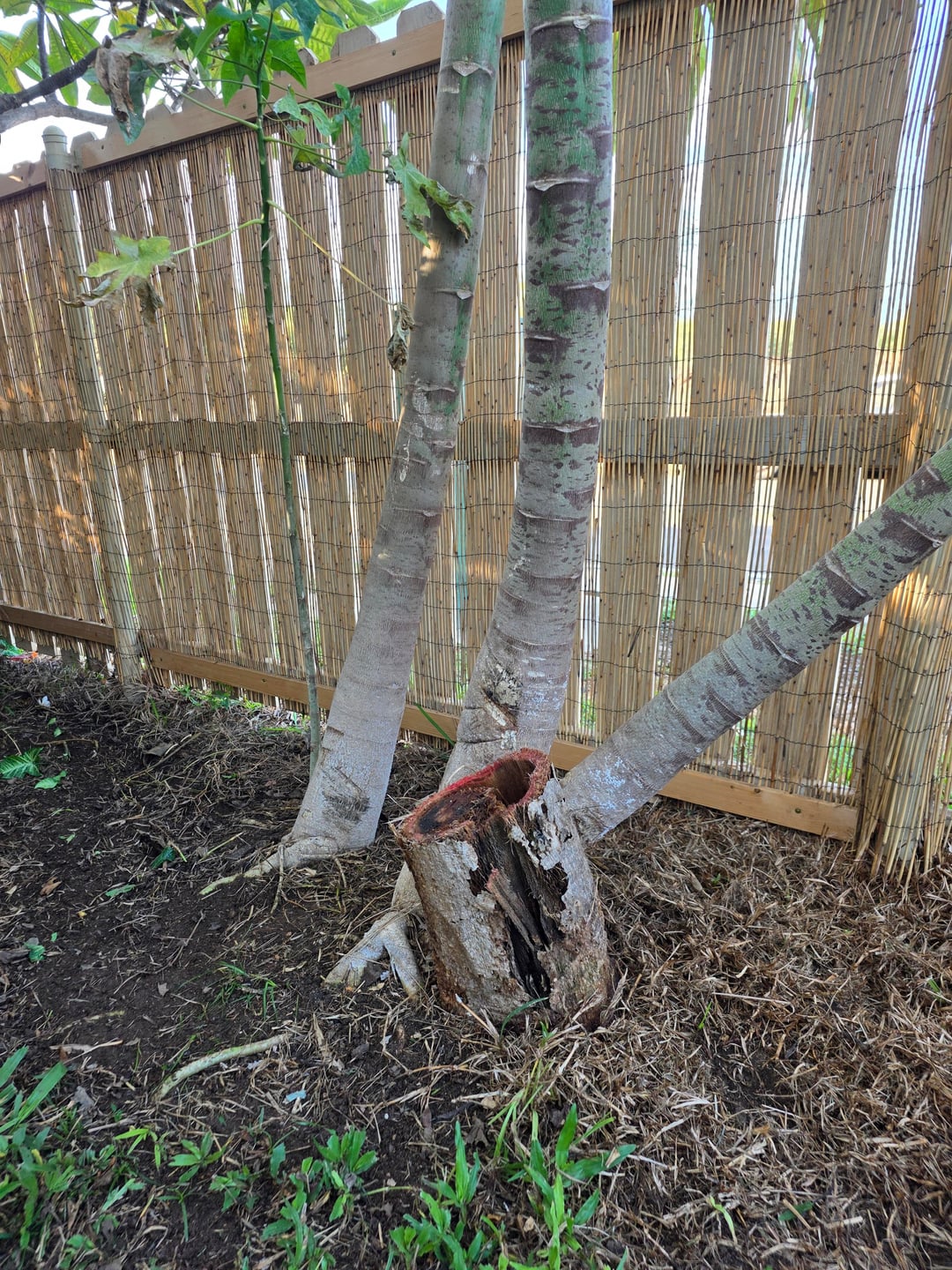 Ich habe auch einfach die sterbende Pflanze abgeschnitten, die braunen Blätter beschnitten und alles mit Neemöl besprüht. Auf dem ersten Bild habe ich inzwischen einen Blecheimer über den gefällten Baum gestellt, um zu verhindern, dass Krankheiten eindringen und sich möglicherweise auf die anderen Bäume ausbreiten. Ich habe auch das zweite Bild beigefügt (ganz rechts ist der abgeschnittene rötliche Stumpf, den Sie auf dem ersten Bild sehen, kurz bevor er abgeschnitten wurde), weil es etwas einfacher zu erkennen ist, dass die neuen Triebe nicht genau miteinander verbunden sind, sondern sehr nahe beieinander liegen.
