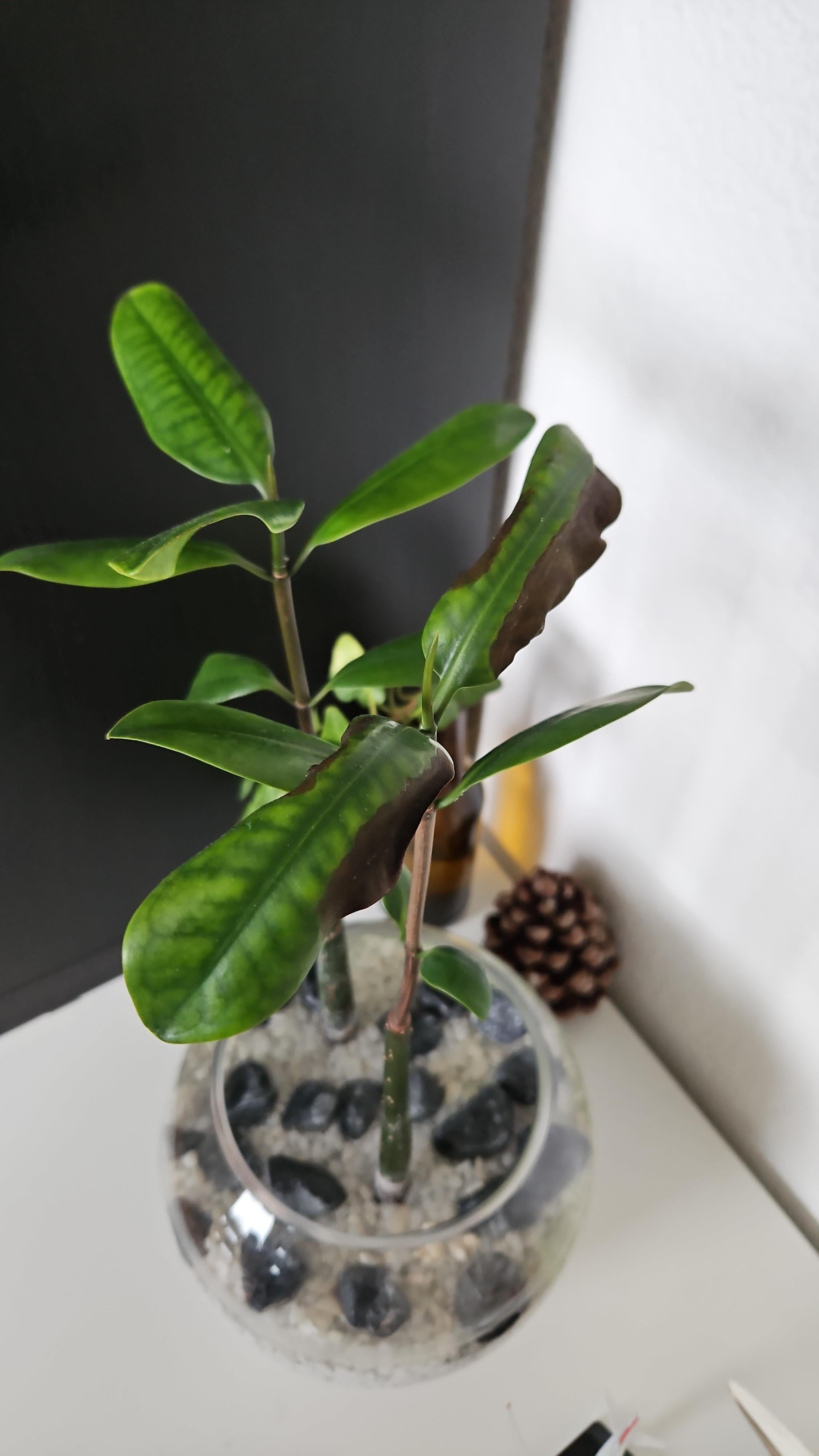 Ich muss kleine Mangroven in ein Glas mit Wasser geben, eine davon hat braune Flecken, wie Sie sehen können. Irgendeine Idee zur Ursache? Von: CanHeBearner