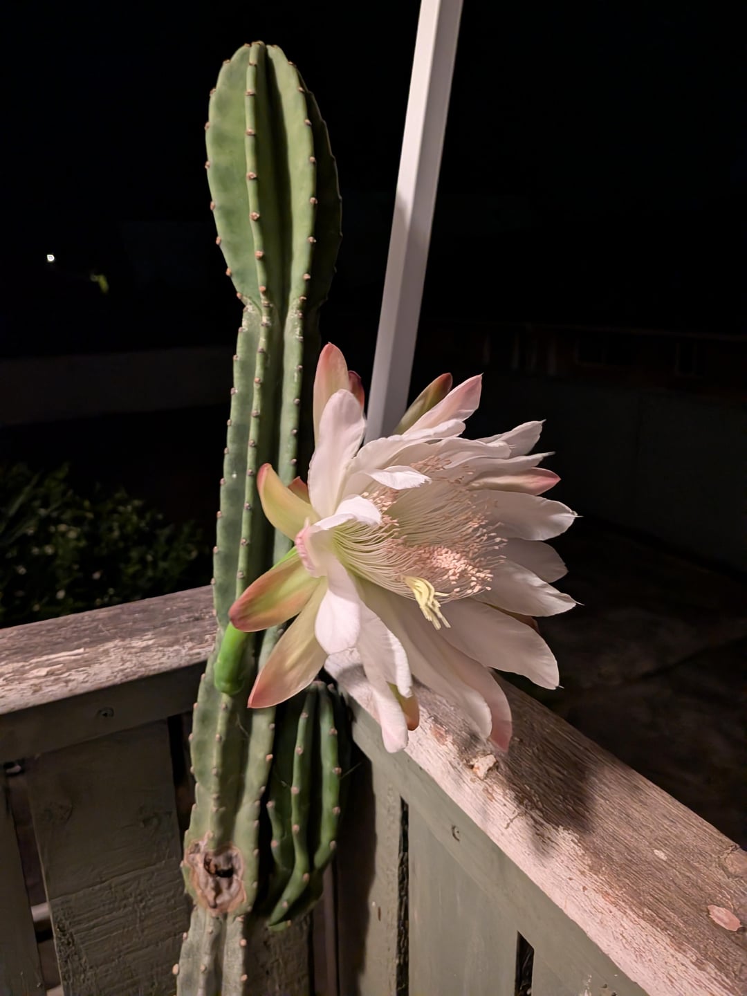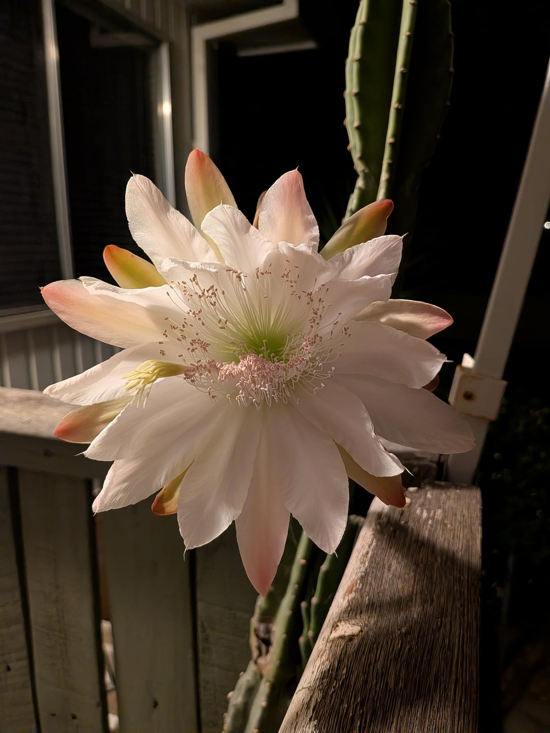 Als ich von einer Spätschicht nach Hause kam, fand ich diesen Kaktus vor, der völlig verlassen, vernachlässigt und zum Sterben zurückgelassen wurde, und aus ihm wuchs diese absolut wunderschöne Blume mit dem erstaunlichsten Duft.