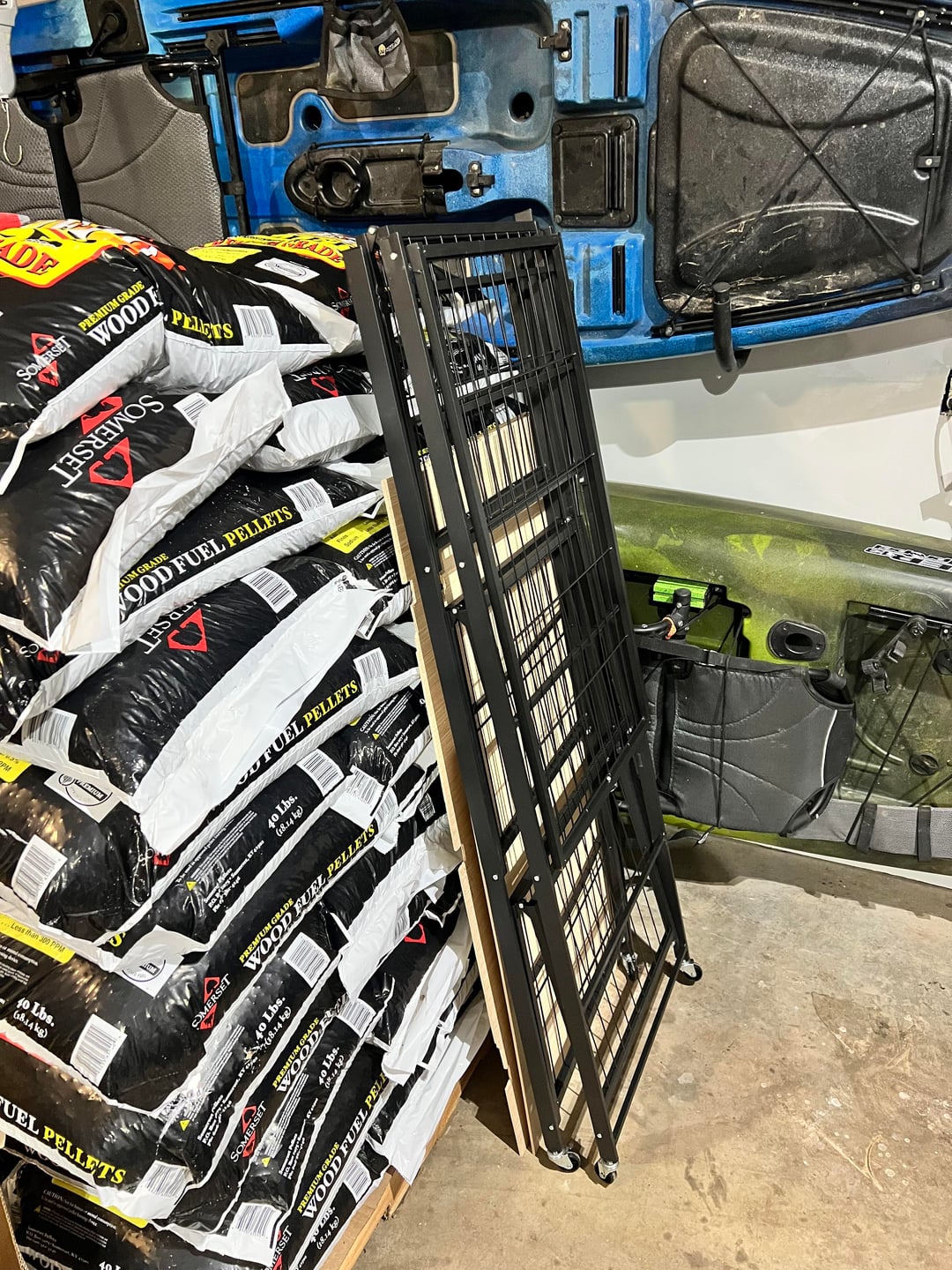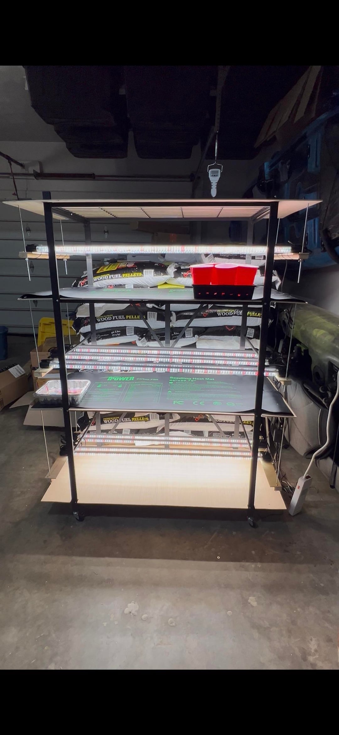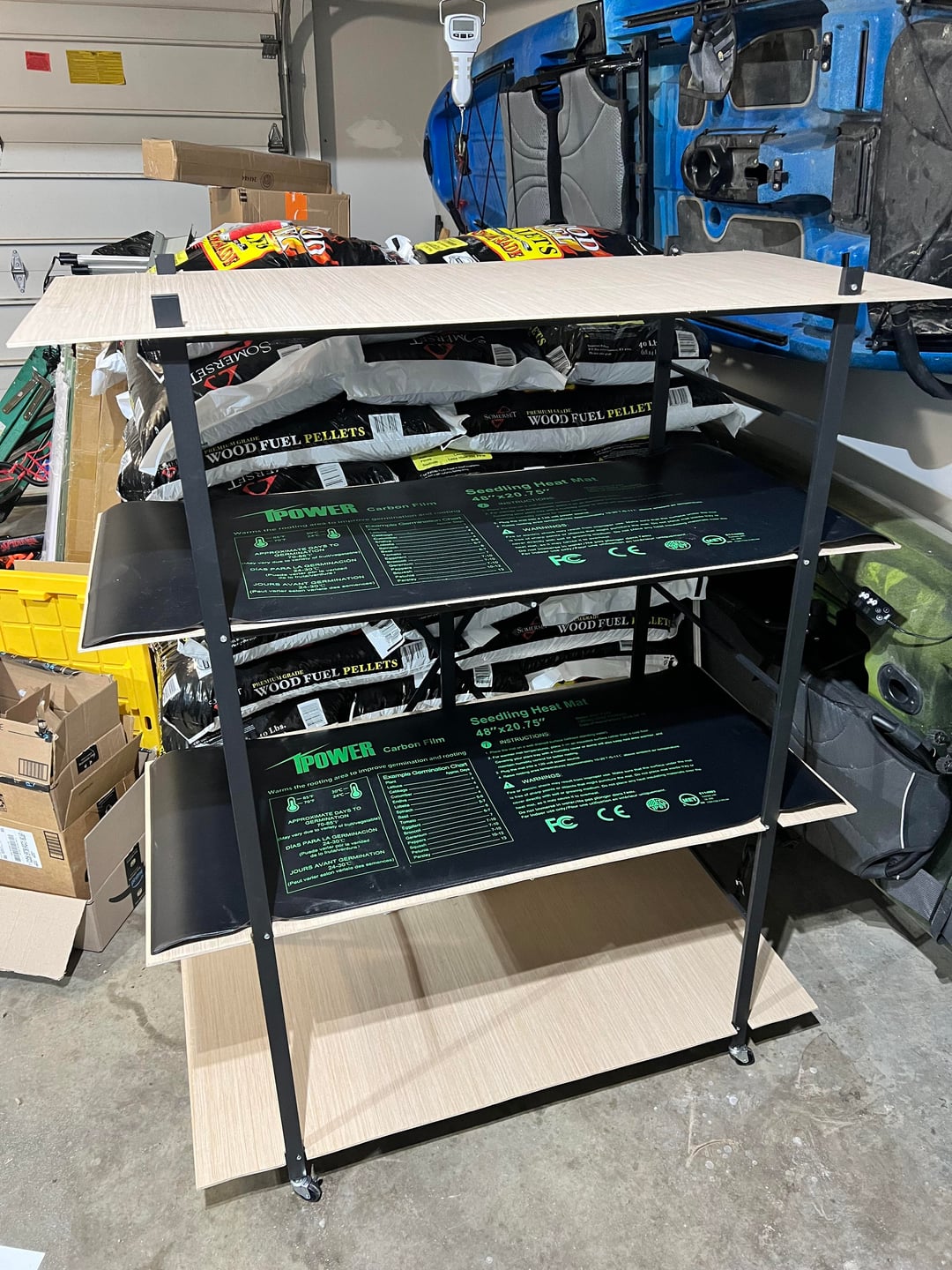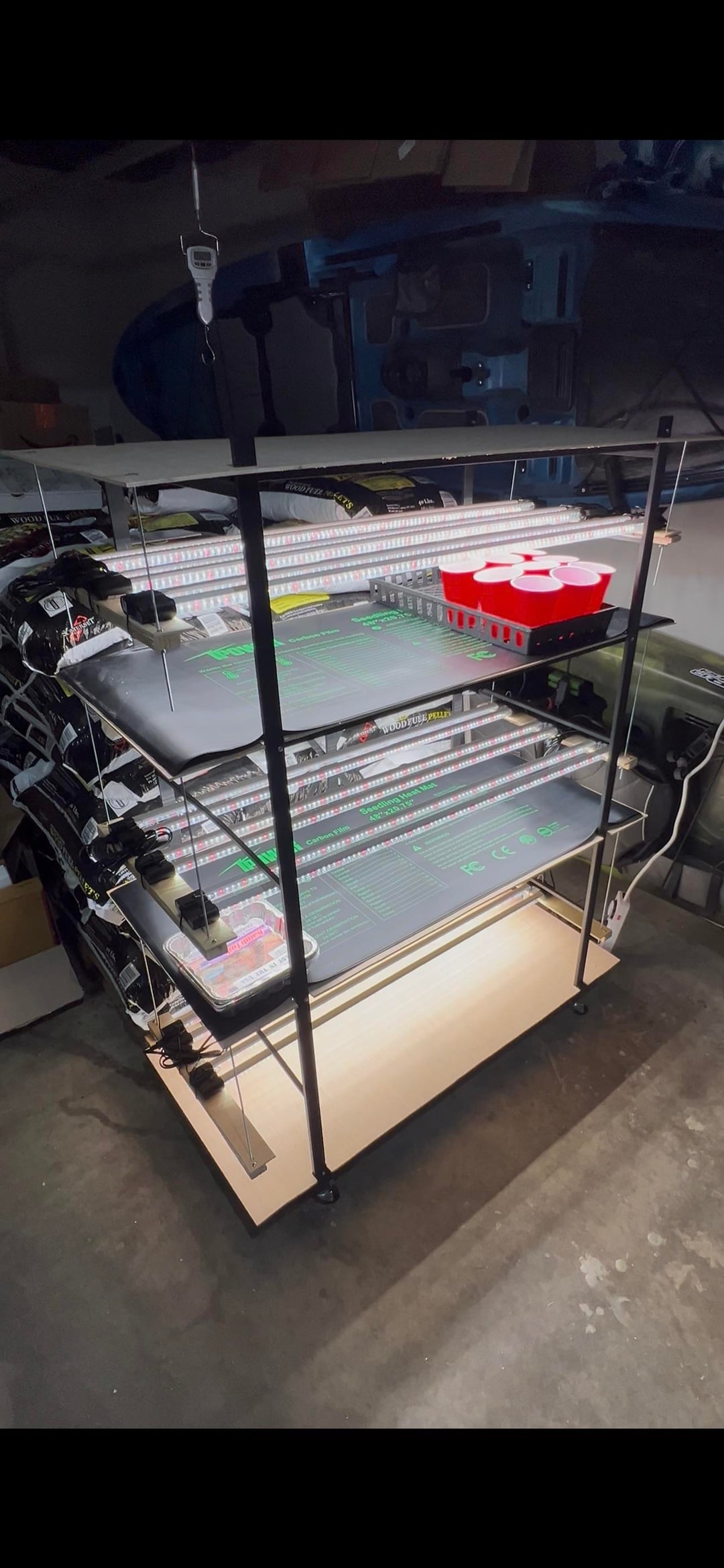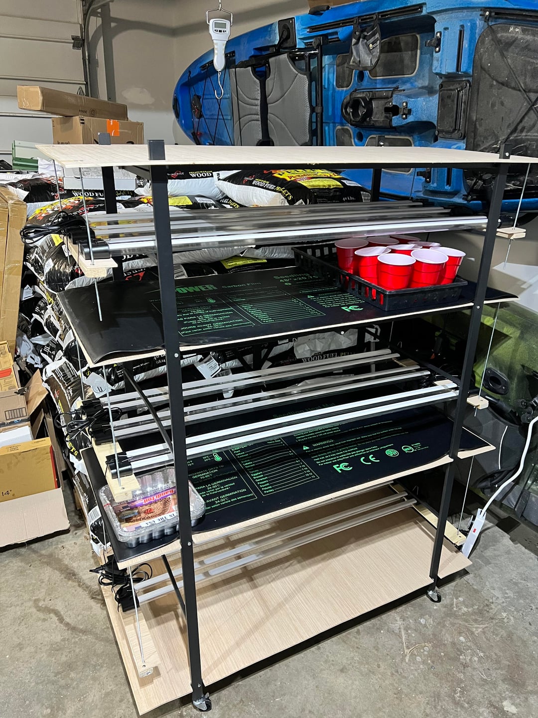 Erste Aussaat. Hier ist mein Setup, ein Vevor-Klappregal zur einfachen Aufbewahrung. Schneiden Sie 1/4-Zoll-Sperrholz für Regale und zusätzlichen Platz. Einige Amazon-„Vollspektrum“-4-Fuß-Leuchten. 3 pro Regal, da meine Regale 21 Zoll tief sind.