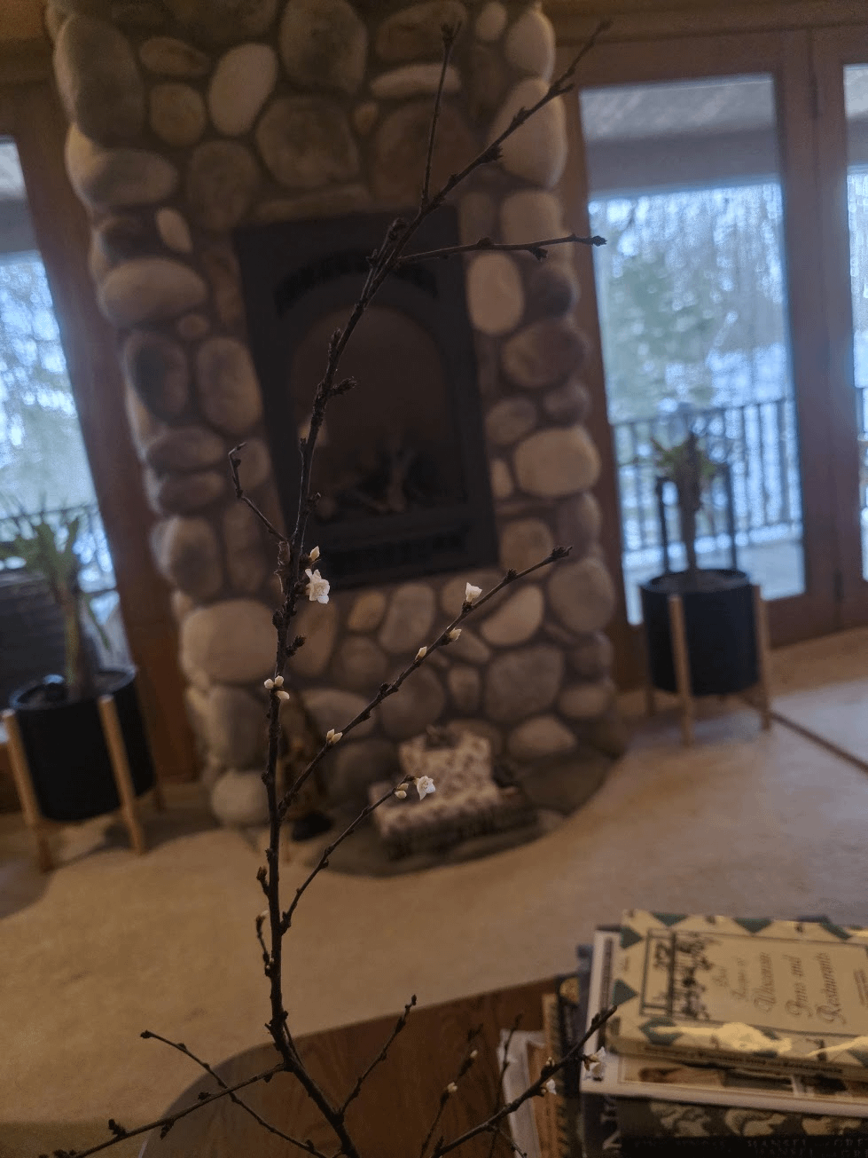 Die jüngsten Eisstürme haben vielen Bäumen und Sträuchern in meinem Garten Äste abgebrochen, darunter auch diesem blühenden Mandelstrauch (den ich so sehr liebe, dass ich ihn umsetzen ließ, als wir größere Arbeiten im Garten erledigten). In der Hoffnung, ihn zu retten, brachte ich einen der gesünderen abgebrochenen Zweige ins Haus und legte ihn ins Wasser. Nun, es hat angefangen zu blühen! Ich schätze, es denkt, es sei Frühling.