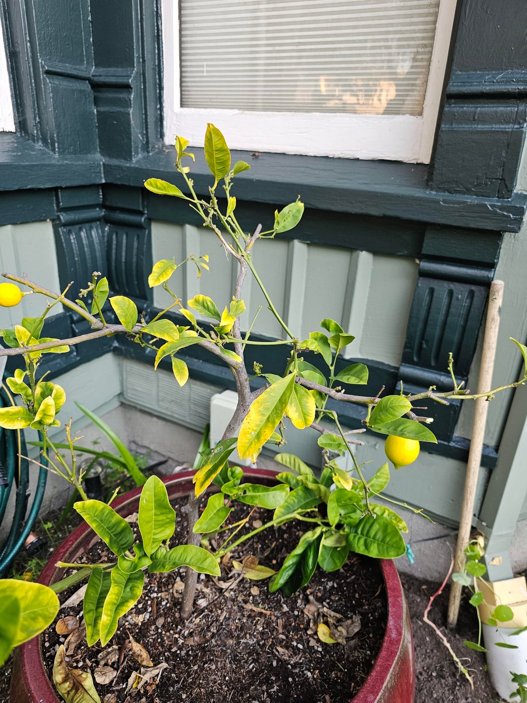 Bay Area, Kalifornien; Zone 10a. Ich habe diesen extrem deprimierten Zitronenbaum geerbt, als ich letztes Jahr an einen neuen Ort gezogen bin. Es ist mehrere Jahre alt, in einem riesigen Behälter eingetopft (kann es nicht bewegen), steht direkt an der Westfassade eines Hauses mit ca. 4 Stunden direkter WINTERsonne (mehr im Sommer, habe keine Zeitmessung durchgeführt). Anekdotisch ist, dass es nie gut gediehen ist und unter unregelmäßiger Bewässerung/Düngung gelitten hat. Im Frühjahr 2025 bekam sie nur wenige Blüten und alle ließen alle grünen Früchte fallen, bevor sie überhaupt zitronenförmig aussahen.