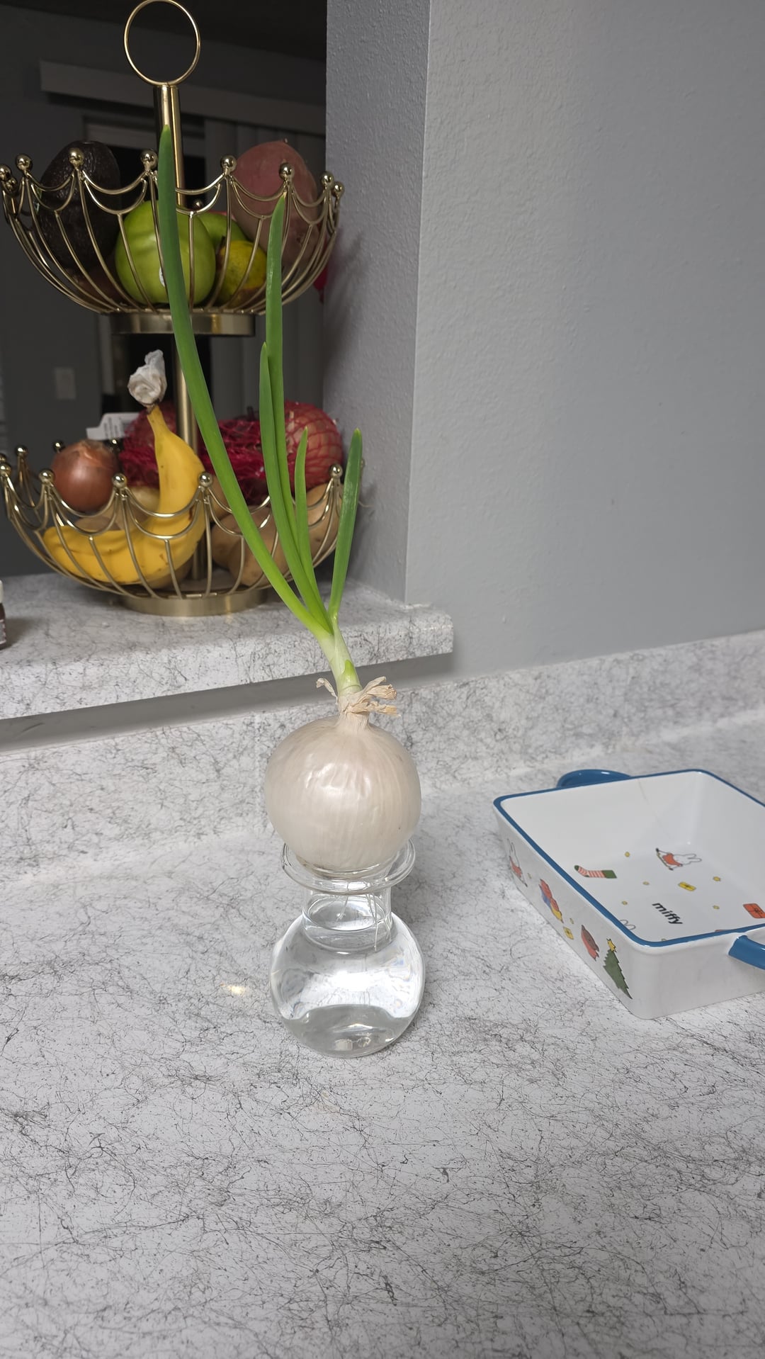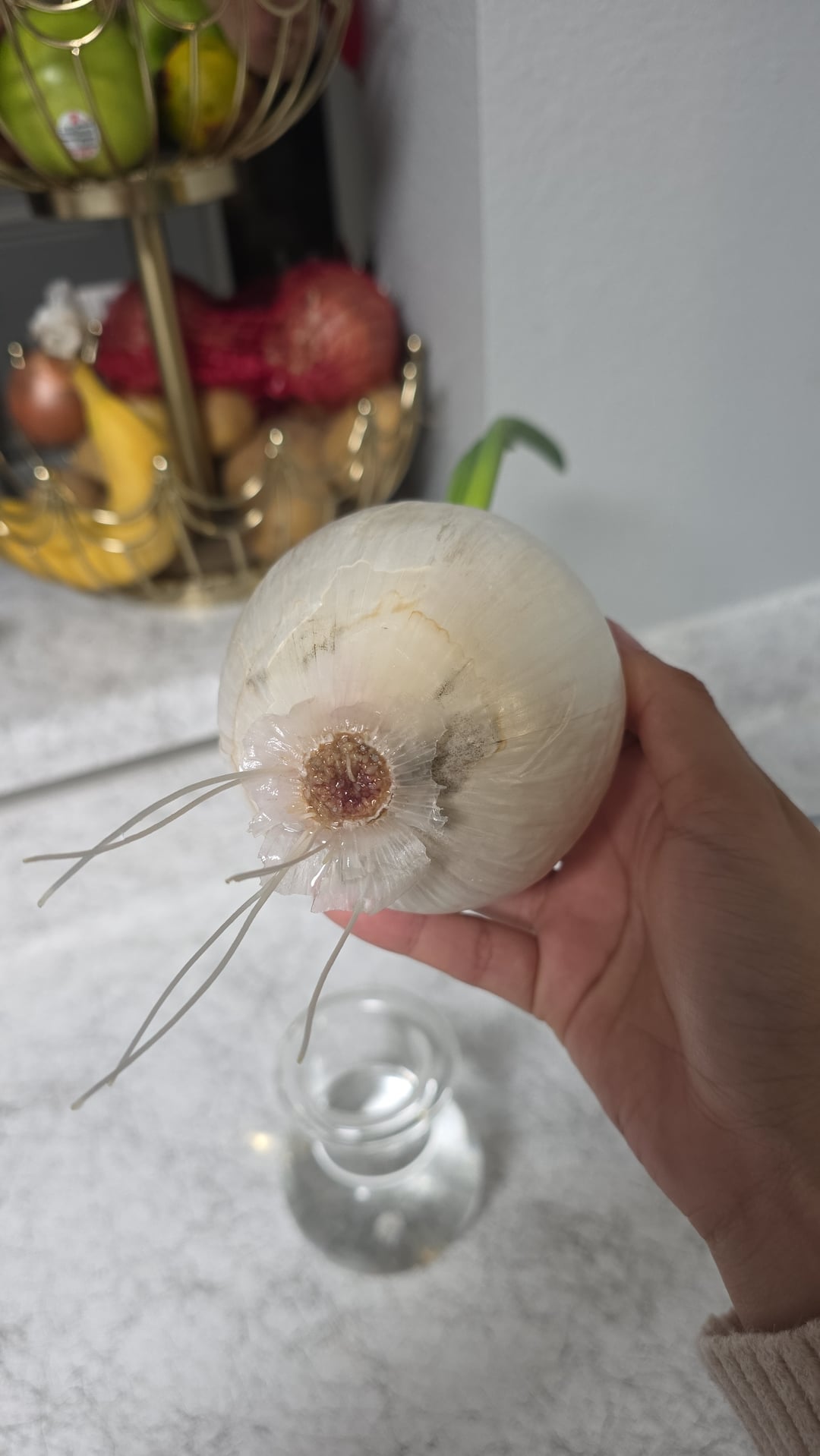 Vor ein paar Tagen bemerkte ich, dass meine Zwiebel zu sprießen begann, also beschloss ich, sie in eine Vase mit Wasser zu stellen und nur die Wurzeln zu berühren. Die gute Nachricht ist, dass es gedeiht und wächst. Die schlechte Nachricht ist, dass sich anscheinend Schimmel auf der Außenhaut und in der Nähe der Wurzeln befindet. Es ist fest, bis man den Boden erreicht, wo die Form beginnt, es fängt an, sich etwas zart anzufühlen.