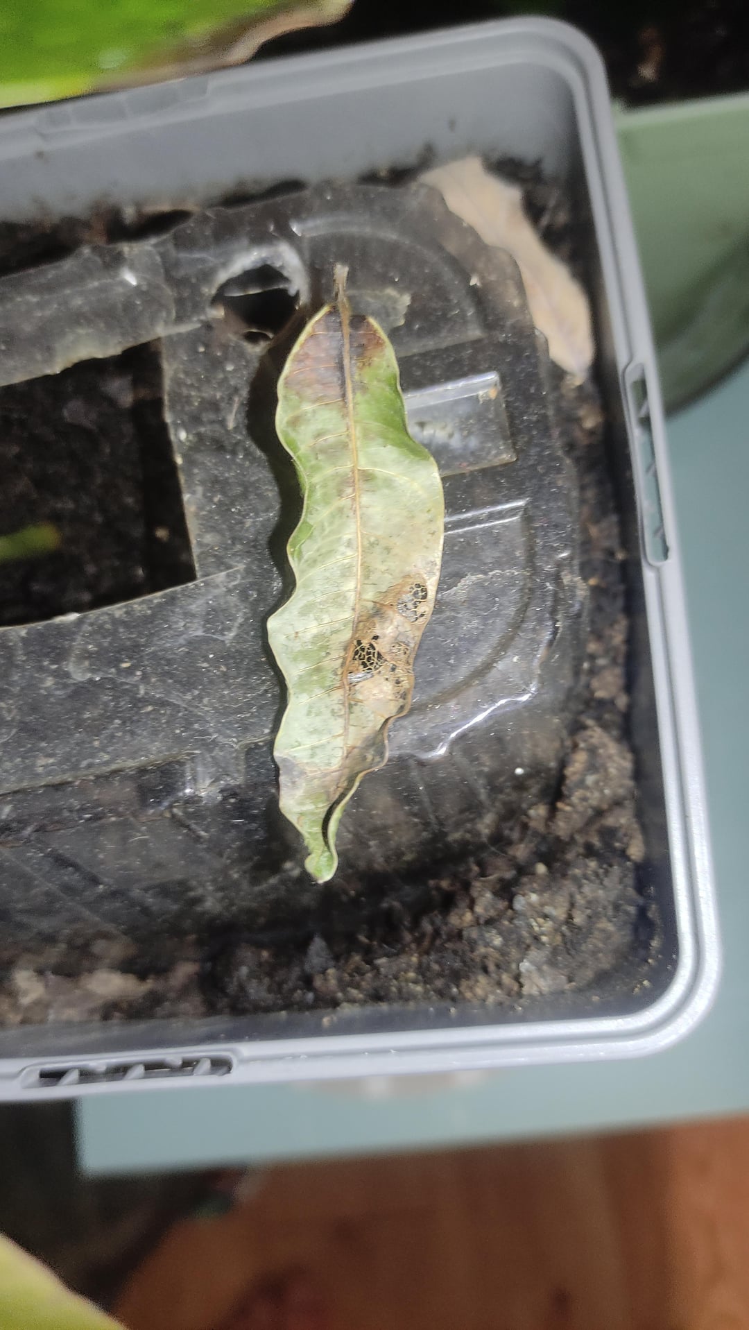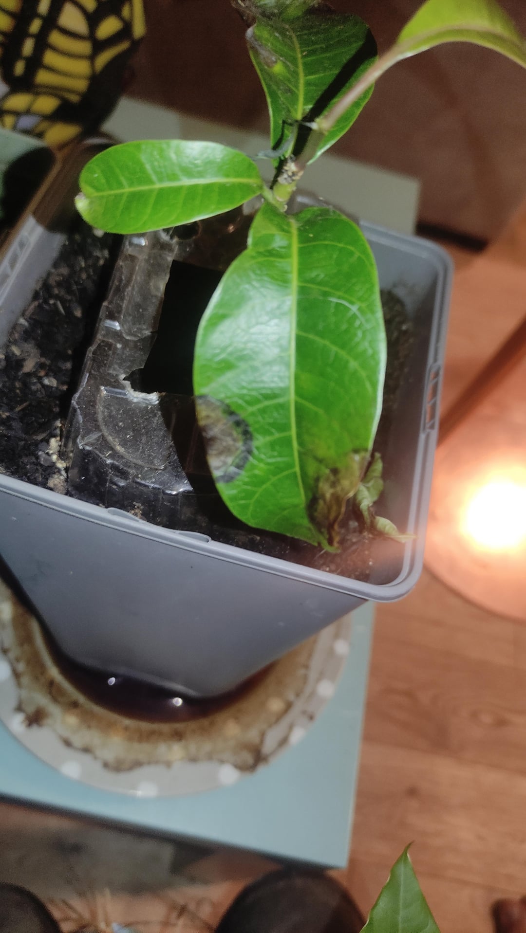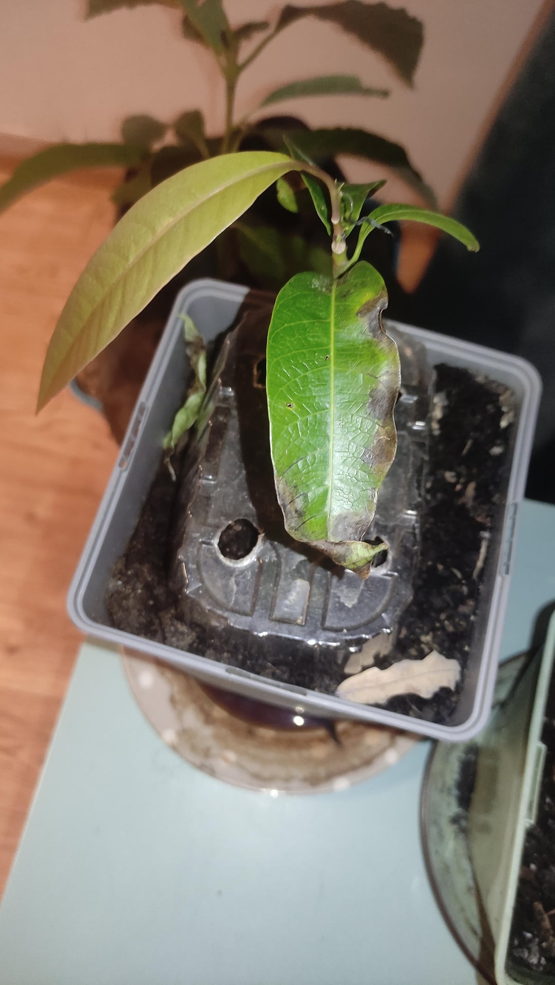 Ich habe diesen Mangobaum vor fast einem Jahr gefällt, aber im Moment werden die Blätter hart, schwarz und brüchig. Ich gieße es nicht sehr regelmäßig, weil ich in wechselnder Obhut bin, also würden wir sagen, 4-5 Mal im Monat, wenn ich regelmäßig bin. Es ist Wasserstress, oder?