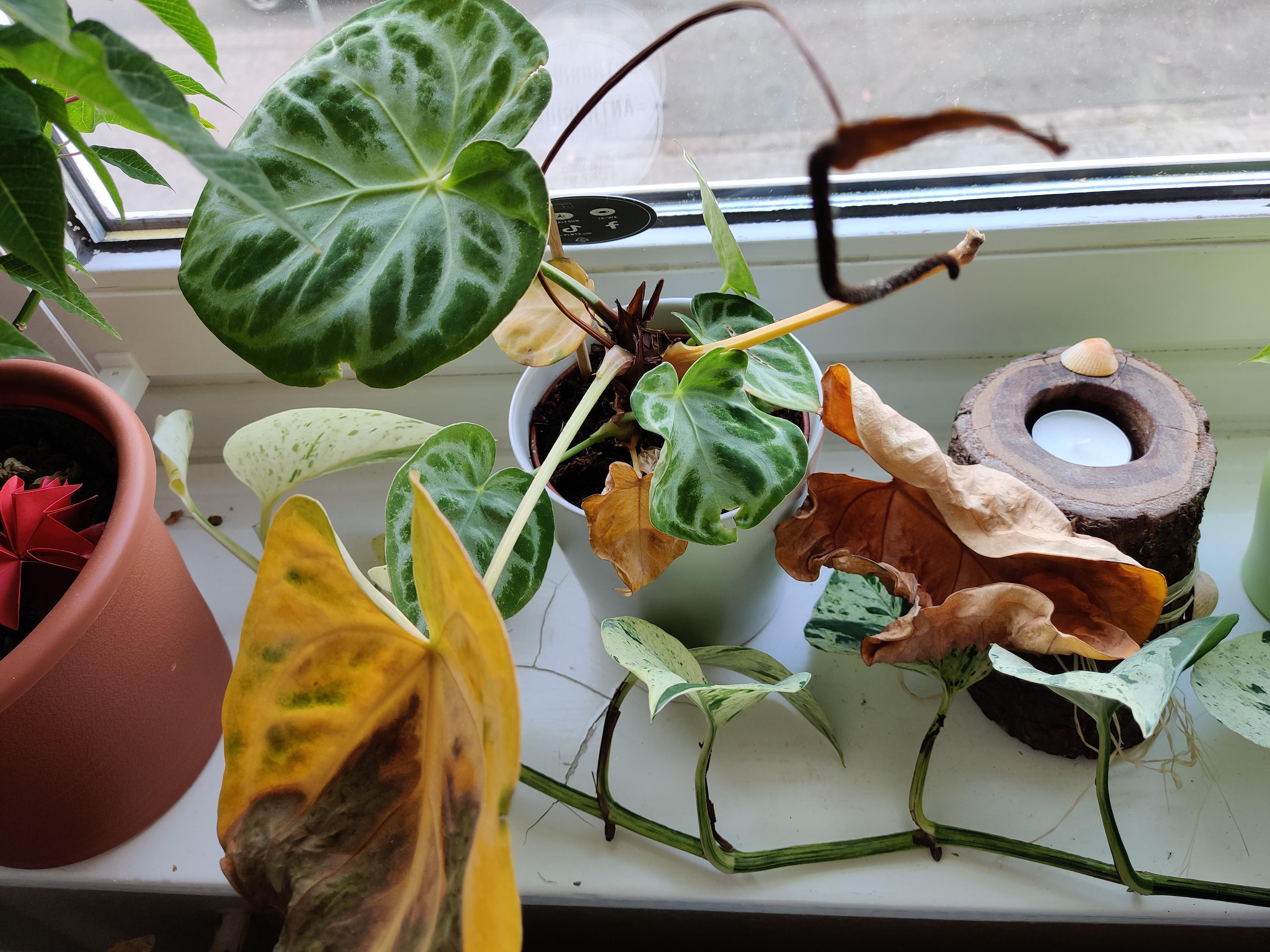 Die Pflanze steht an einem Fenster Richtung Westen, es sind ca. 18 Grad im Zimmer. Sie hat kürzlich zum ersten Mal geblüht, die trockenen Blätter könnten in etwa zeitlich mit der Blüte übereinstimmen, aber so richtig geachtet habe ich darauf nicht…