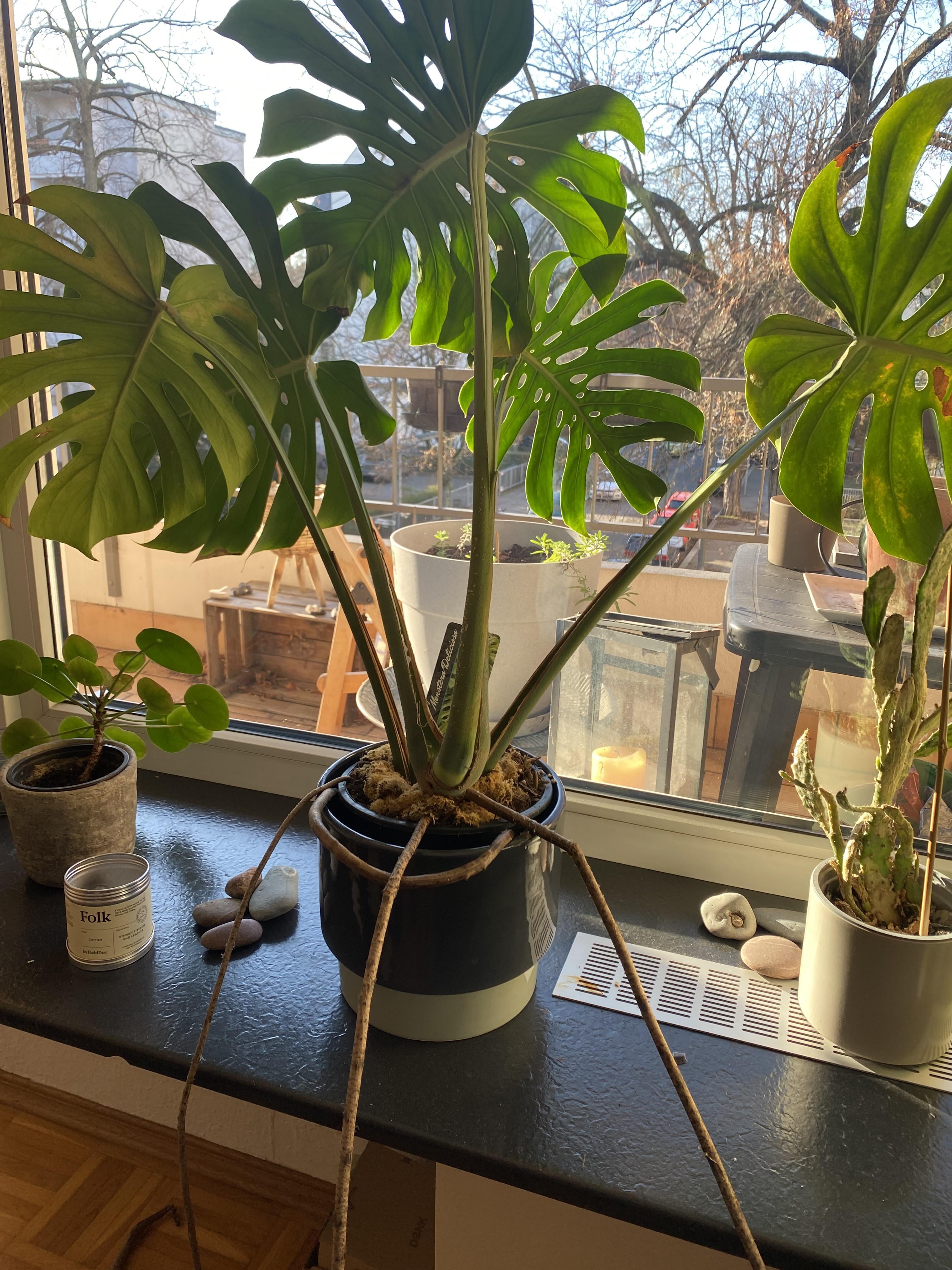 Die Gute habe ich seit circa einem Jahr- in der Zeit hat sie zwei neue Blätter ausgebildet und sieht eigentlich ganz fit aus. Allerdings drehen die Luftwurzeln langsam ab. Monsteras mögen es ja eigentlich eng, frage mich trotzdem, ob sie bald ein neues zu Hause braucht? Wie mischt ihr euer Substrat an? Und liege ich richtig mit der Vermutung, dass sie Dünger braucht? (Die Wurzeln sind ja eigentlich ein Zeichen für ihre Suche nach Nährstoffen, oder?)