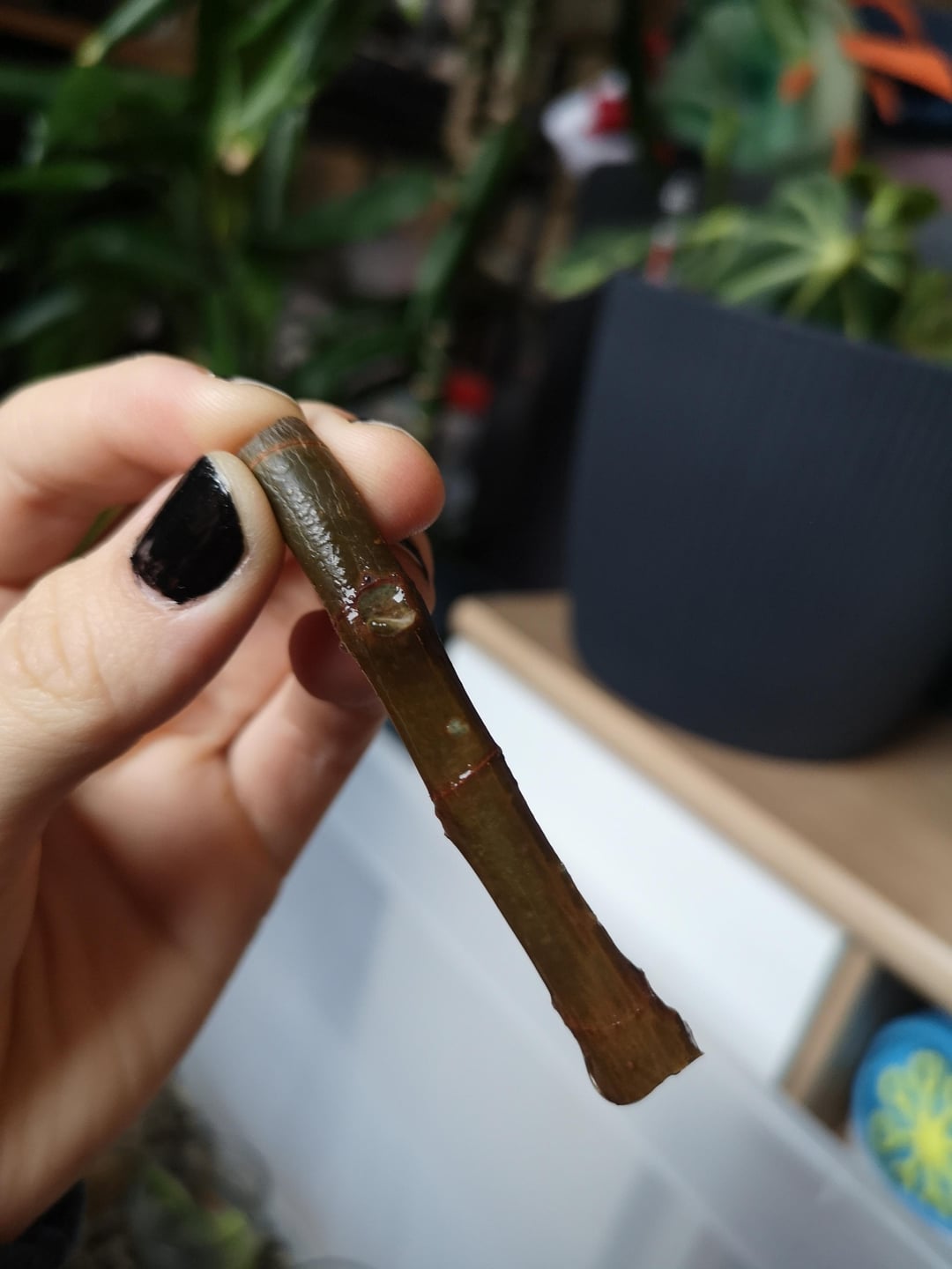 Ich hab ein paar Pflanzen geschenkt bekommen, die wohl den kompletten Tag bei mehreren Minusgraden draußen waren. Teilweise sterben sie leider einfach nur weg, diese eine wollte ich aber unbedingt wissen, welche das ist. Sie erinnert mich ja an nen Gummibaum, aber die Blätter haben soooo gut geduftet. Allein durch den Geruch hab ich mich in diese Pflanze verliebt. Ihre Wurzeln waren komplett am Arsch, darum hab ich versucht, sie neu zu bewurzeln, hat auch ne Zeitlang gut ausgeschaut, nur heute war an dem Auge so ne komische glitschige Flüssigkeit, wie würdet ihr vorgehen, um sie zu retten?