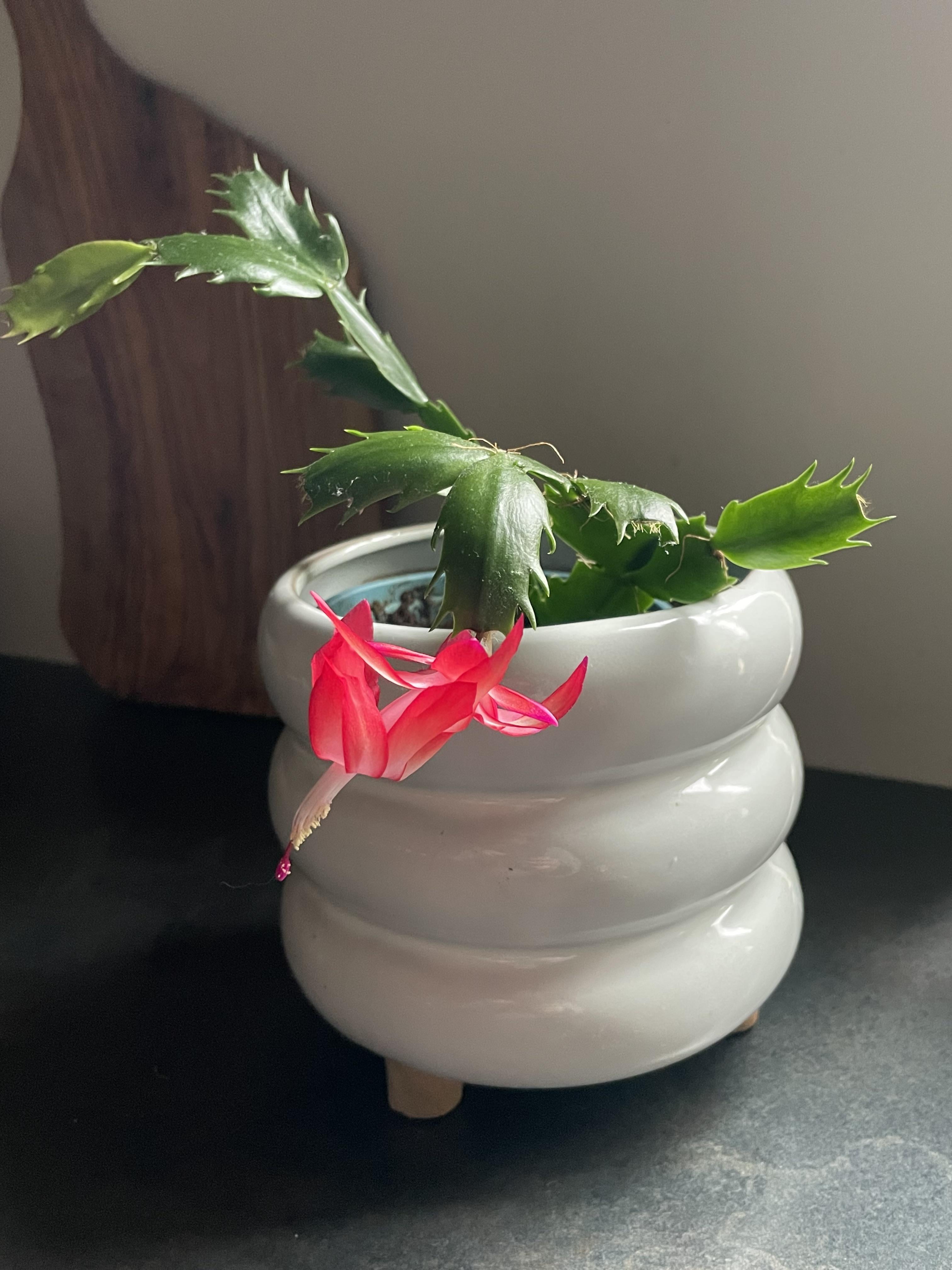 Es begann mit einem kurzen Stück Weihnachtskaktus, den ich letztes Jahr in einem Geschäft auf dem Boden fand. Ich habe es mit nach Hause genommen und in etwas Erde gesteckt, und jetzt schmückt es unser Zuhause mit einer Blüte!