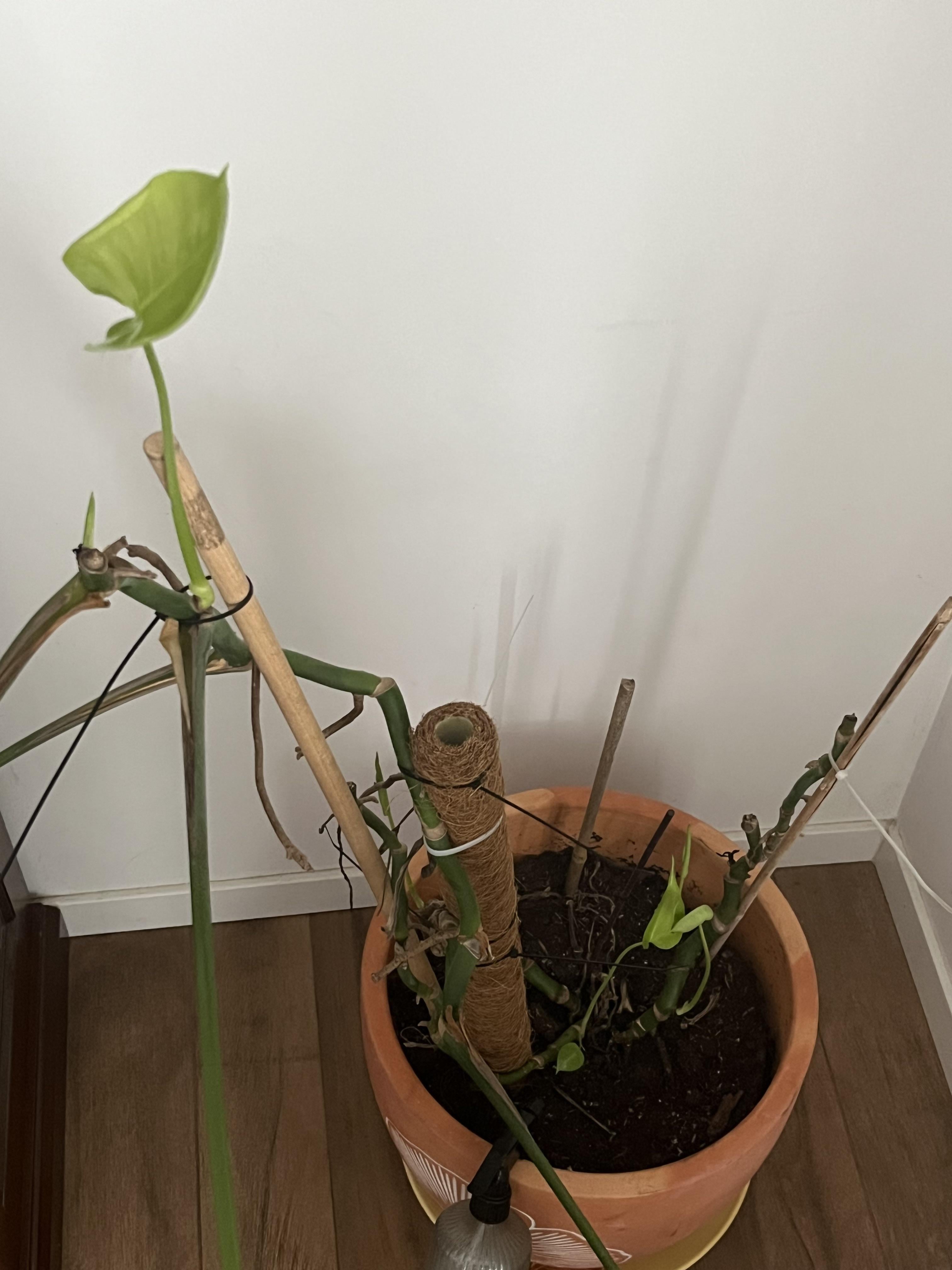90% aller Blätter waren am sterben – jetzt sprießen aus 6 Stellen neue Blätter gleichzeitig!! (Ich glaube, dass es an eine Kombination aus Thripsen und zu nasser Erde lag. Nachdem die Thripse weg waren und die Erde lange Wochen nichtmehr gegossen wurde)