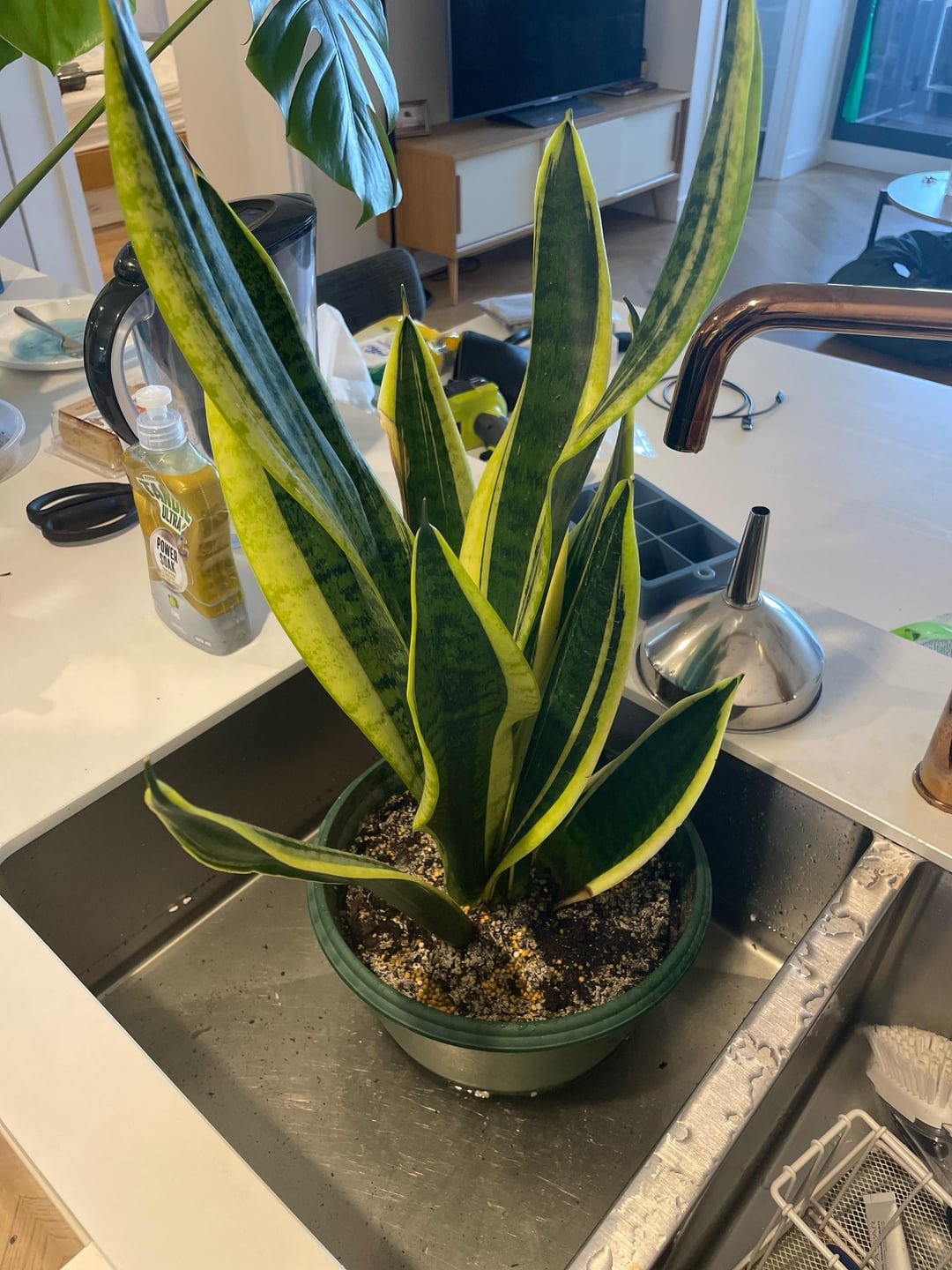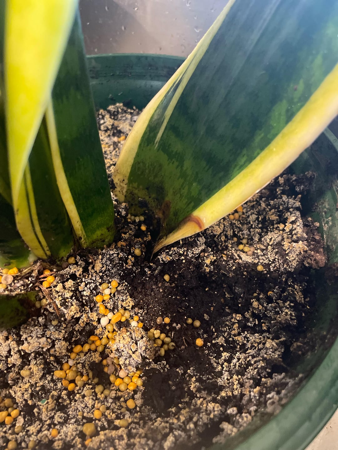 Ich verwende immer noch die Erde, in der sie geliefert wurde und die völlig dunkle Erde aussah. Habe Bimsstein darüber gegeben und ihn in einen kleineren Topf umgetopft.