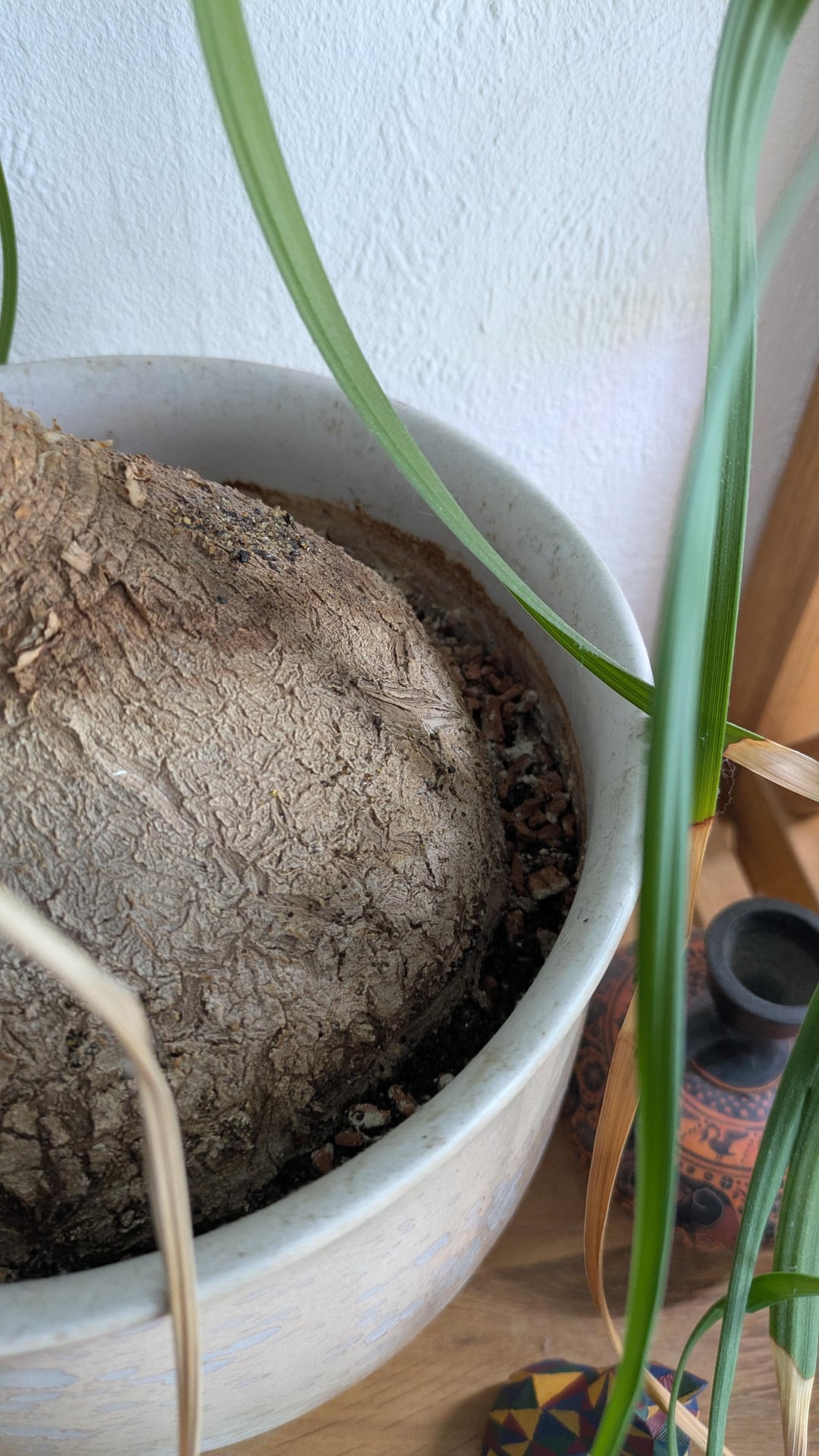 ich frage mich, ob ich diesen Elefantenfuß mal umtopfen sollte. Einerseits lebt er natürlich sehr beengt und etwas mehr Substrat und Luft würde den Wurzeln bestimmt nicht schaden, andererseits beschwert sich der Gute (außer ein paar trockenen Spitzen) auch nicht und wächst munter vor sich hin.