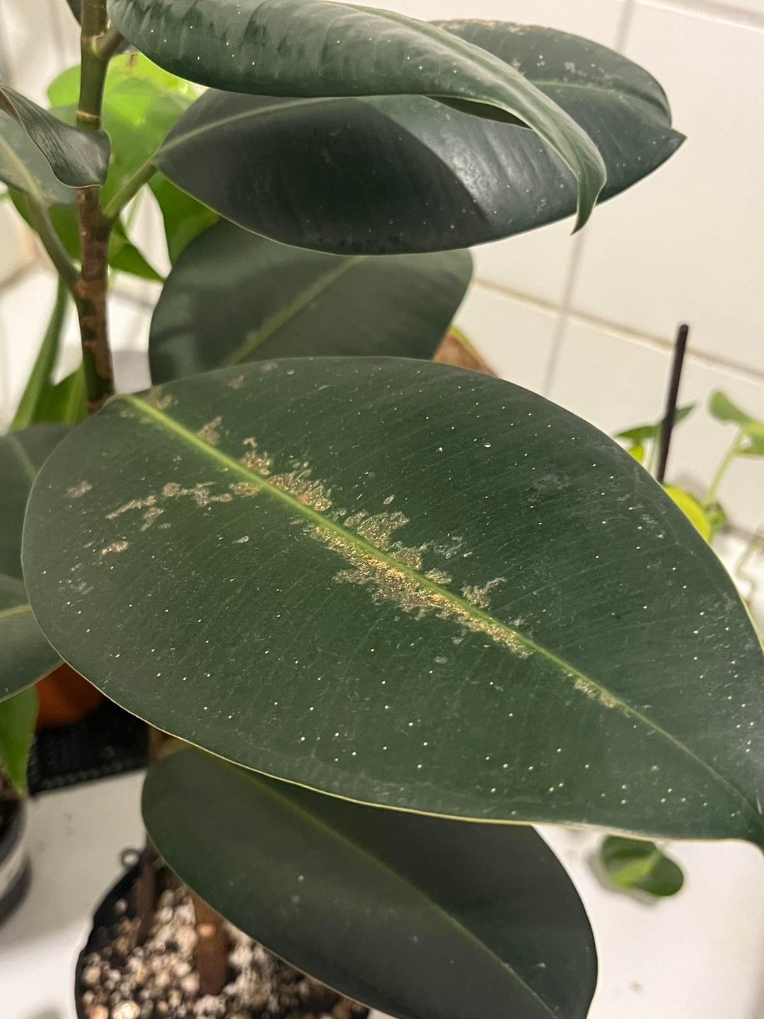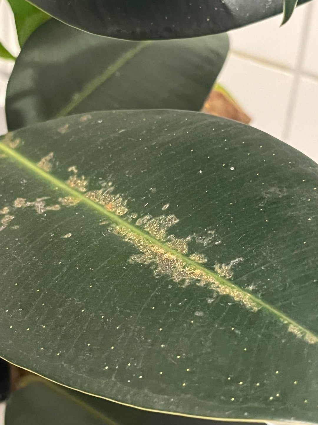 Mein Gummibaum hat schon länger diese Narben an der Blattmitte. Die unteren Blätter sind alle gesund, es sind nur die oberen mit dieser Krankheit, falls es eine ist. Manchmal bekommt er ein neues Blatt, das klein bleibt und auch so „vernarbt“ ist, und manchmal bekommt er gesunde neue Blätter, die normal wachsen, und entweder auch vernarbt sind oder makellos.
