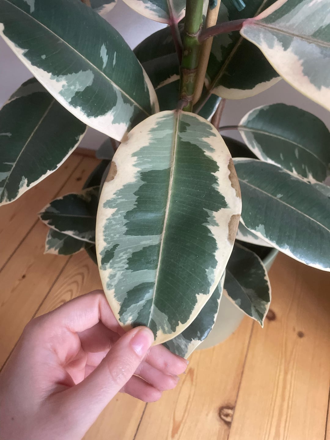 Ich habe diesen Ficus zu Hause und ich glaube, ich gieße ihn zu viel, obwohl ich ihn nicht so oft gieße??? Ich weiß nicht, was ich tun soll, damit die Blätter keine braunen Flecken mehr hinterlassen 🙁