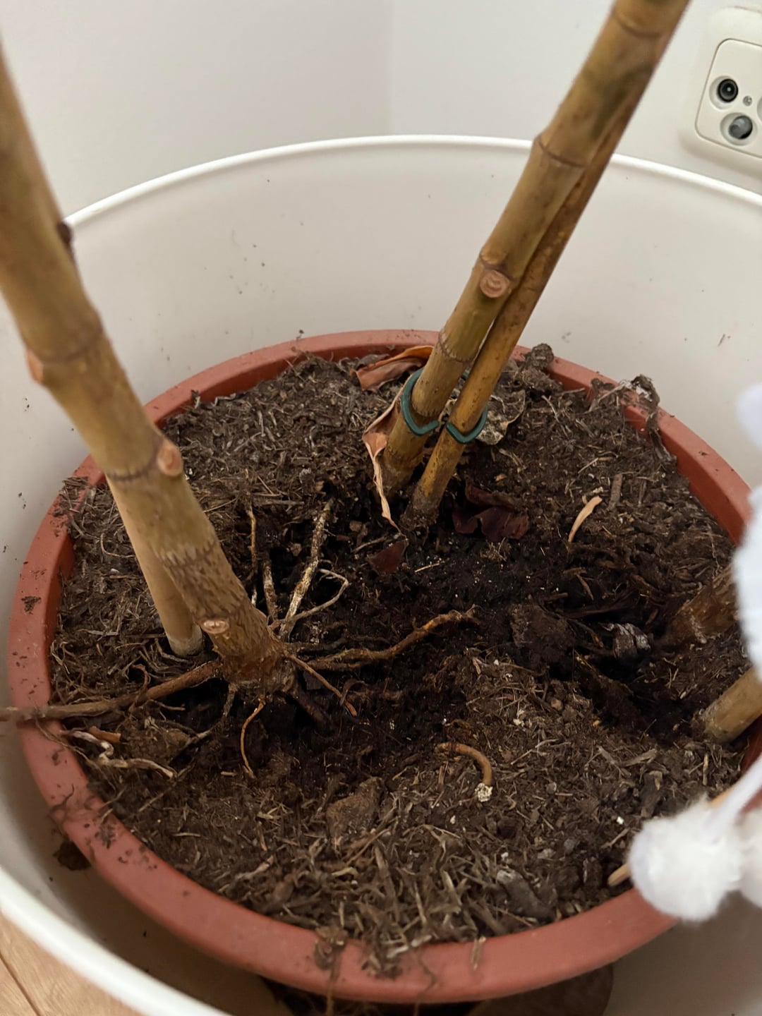 Die Erde sieht meines Erachtens normal aus… man sieht nur schon etwas Wurzel… vielleicht umtopfen?