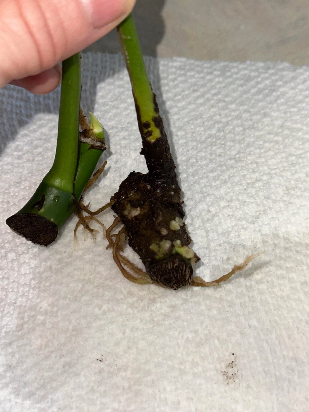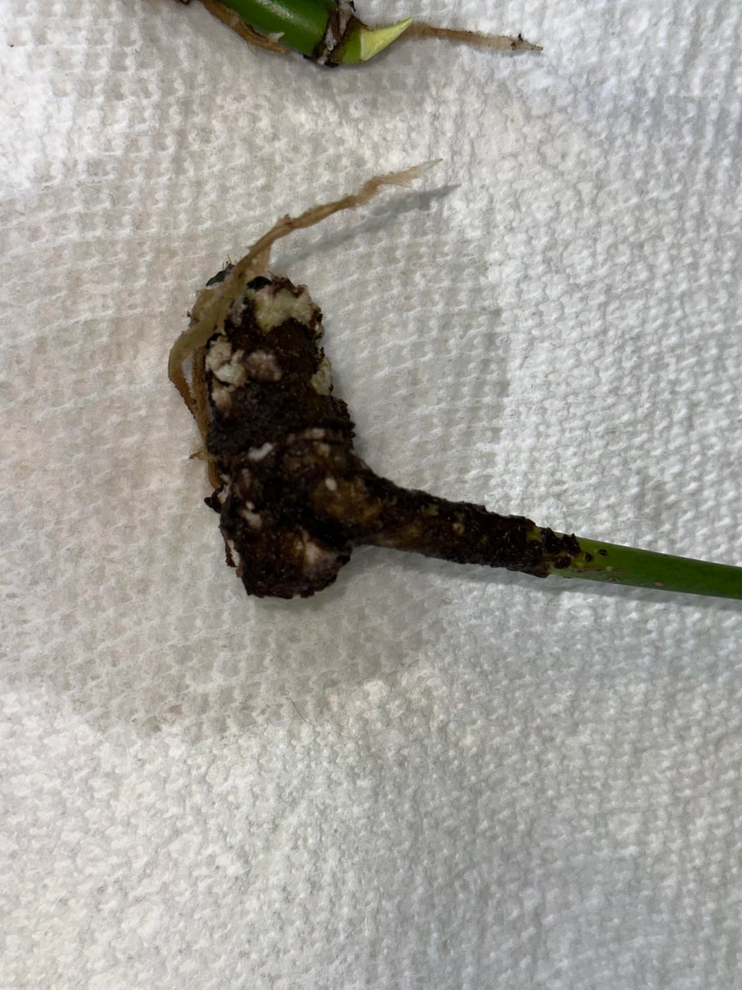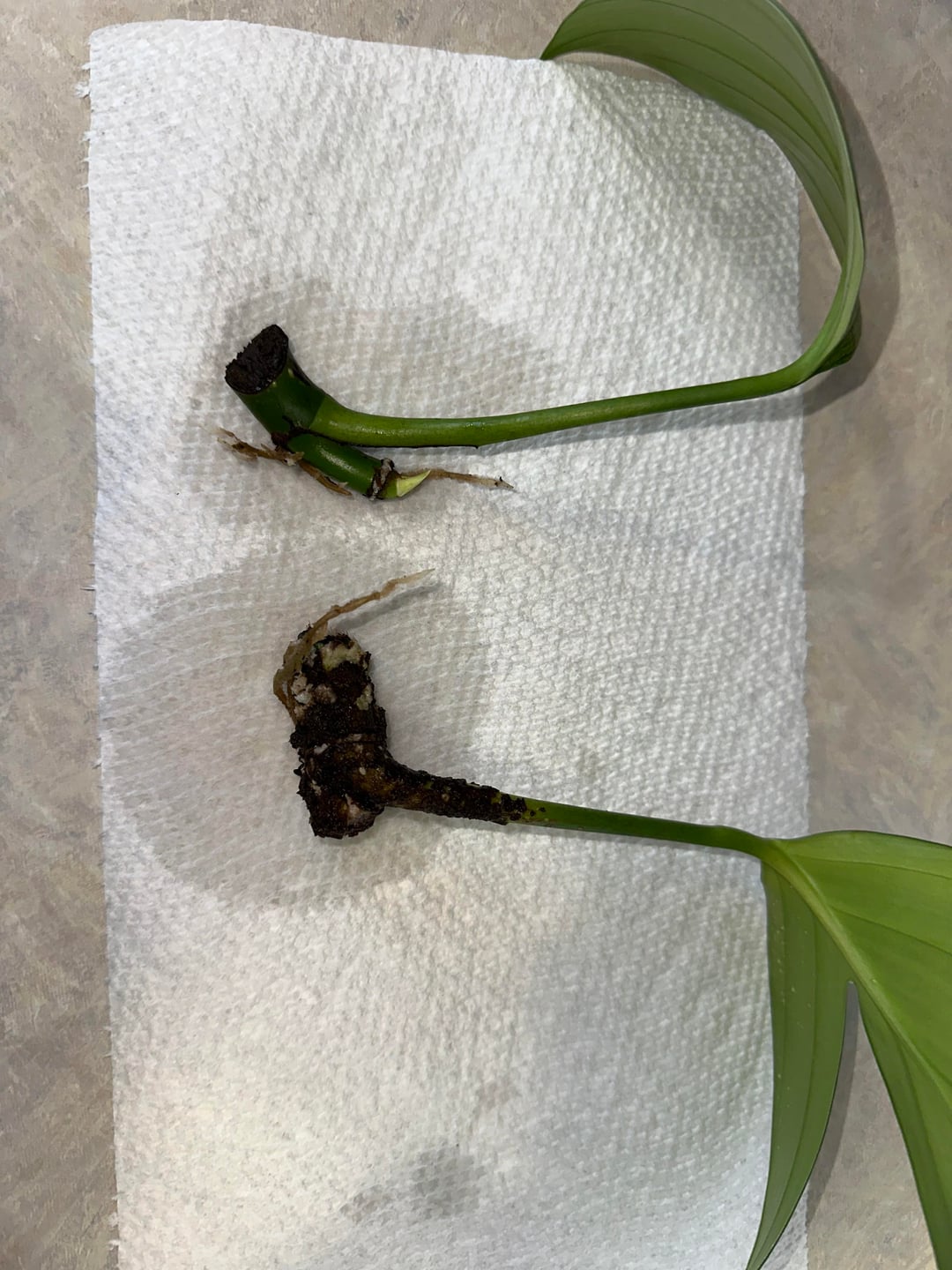 Ich habe versucht, diese beiden Drachenschwanzblätter abzustützen, und eines davon wird braun. Der gesamte braune Teil war ursprünglich mit Urwurzeln bedeckt. Es bildeten sich ein paar Wurzeln, aber der Rest verwandelte sich in eine dicke, braune, strukturierte Masse. Ich habe letzte Woche einen Teil davon sorgfältig abgespült, frage mich aber, was die beste Vorgehensweise ist. Ist das normal? Soll ich es einwirken lassen, abwischen, vorsichtig abspülen oder mit Wasserstoffperoxid besprühen?