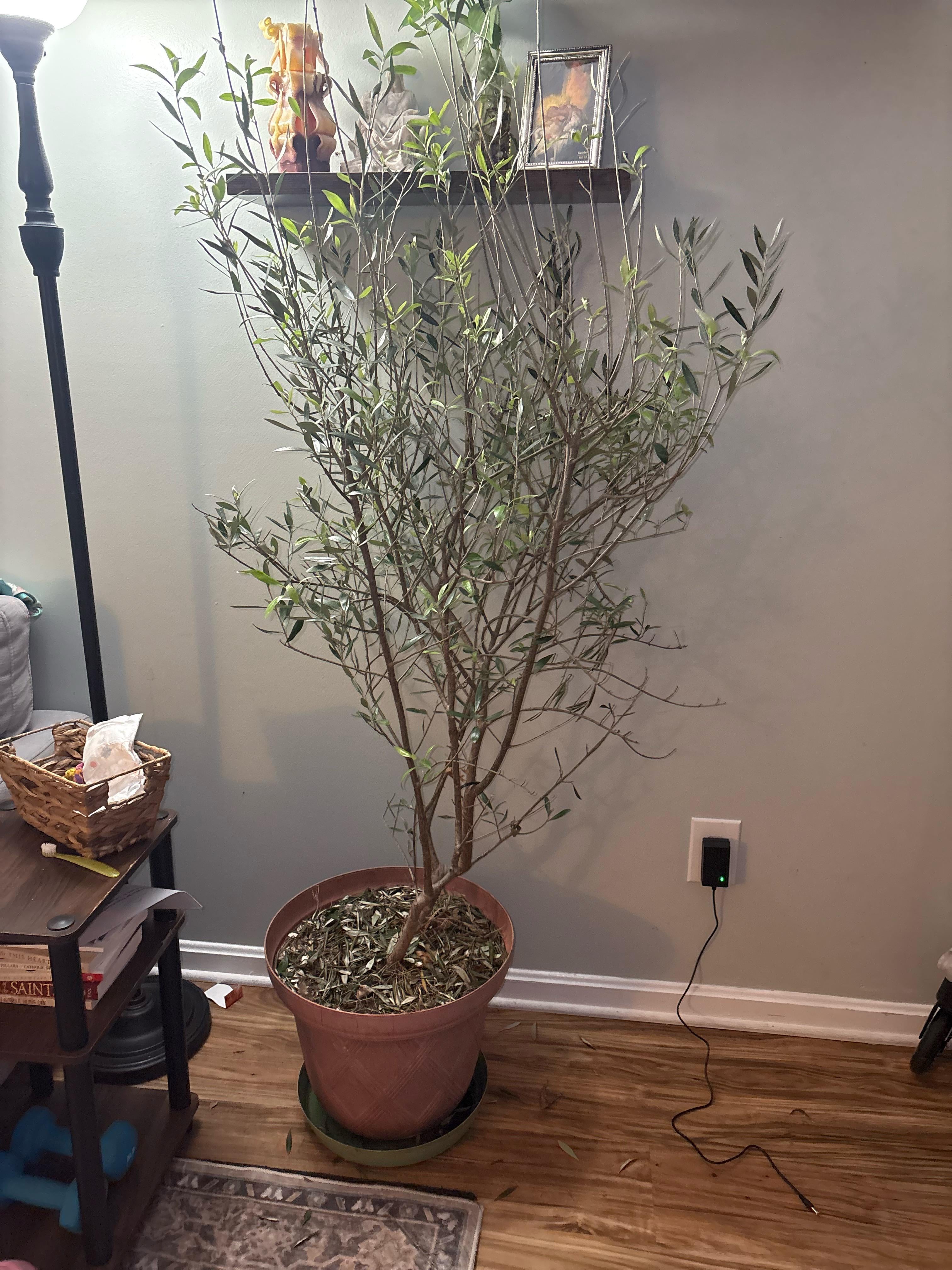 Helfen Sie mir, diesen Baum zu retten. Ich bin ein anerkannter Amateur. Ich kann Friedenslilien und Pothos am Leben erhalten und das ist auch schon alles. Dieser Olivenbaum (im Übrigen unbekannt) wurde mir geschenkt und ich möchte ihn unbedingt retten. Es verliert eine Menge Blätter und alles, was ich gelesen habe, besagt, dass es so viel Sonne braucht, aber im Moment sind es hier täglich 17 °F. Ich habe Angst, es ins Freie zu stellen. Ich habe es gedüngt, als es hier ankam, weil es gegossen werden musste, aber das war alles, wozu ich mutig genug war. Ich habe keine Ahnung, was es bisher durchgemacht hat. Ich glaube, meine Schwester sagte, ein älterer Herr, den sie kannte, würde sie zum Umzug weggeben. TIA!
