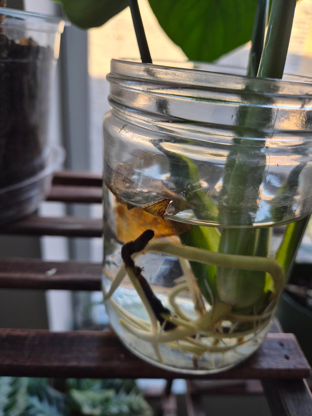 Ich habe diesen Monstera-Steckling seit etwa Weihnachten wachsen lassen, ich habe ihn in ein Glas mit einem Pathos-Steckling gesteckt. Ist sie bereit, Dreck zu fressen, oder soll ich sie weiter kochen lassen? Von: aspicywiener