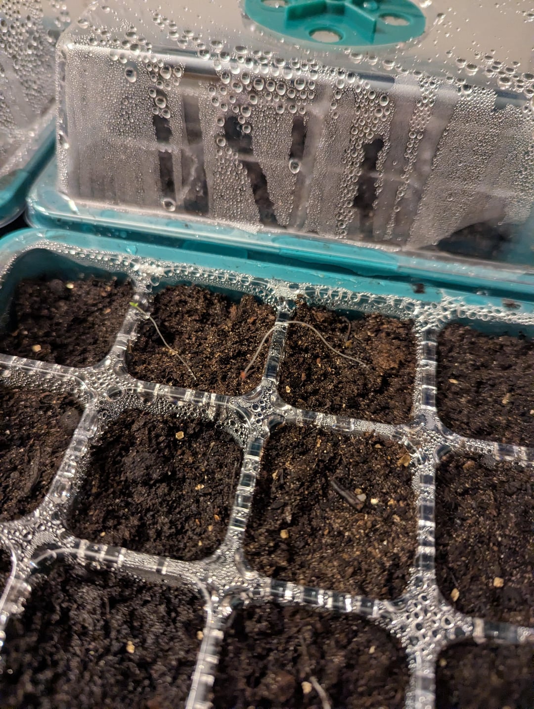 Sie liegen jetzt seit etwa 10 Tagen in einer abgedeckten Setzlingsschale auf einer Wärmematte (wir haben ein Kalthaus) und unter einem Fenster.