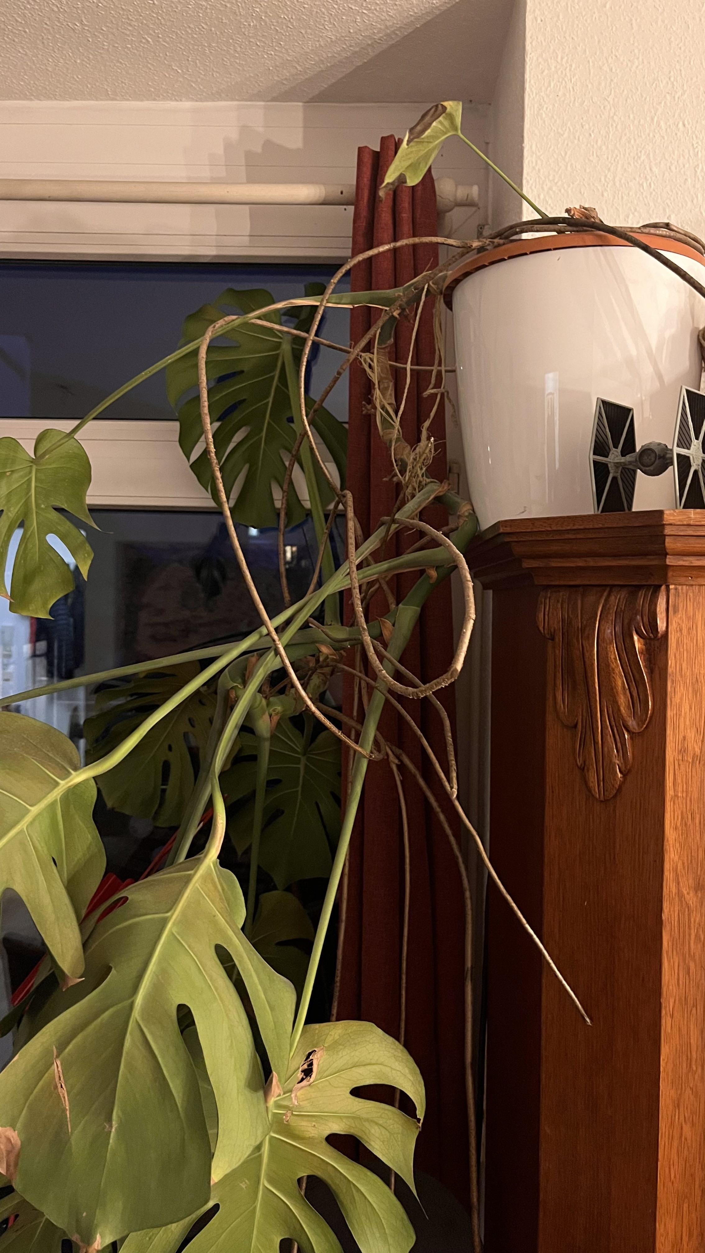 Hi zusammen, die Monstera stand lange auf dem Boden an einem Lichtarme Ort, ich habe sie dann übernommen und aus Platzgründen auf den Schrank gestellt. Da fühlt sie sich zwar wohl, ich hätte sie aber lieber auf dem Boden aber dafür noch oben wachsend. Der Topf ist schon beschwert, sonst wäre sie schon lange heruntergekracht. Was habe ich für Möglichkeiten? Danke im Voraus 🙂