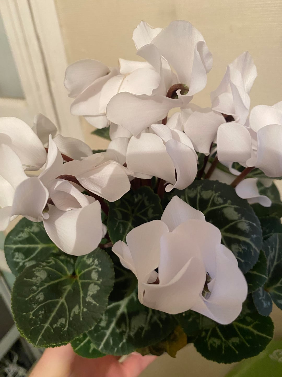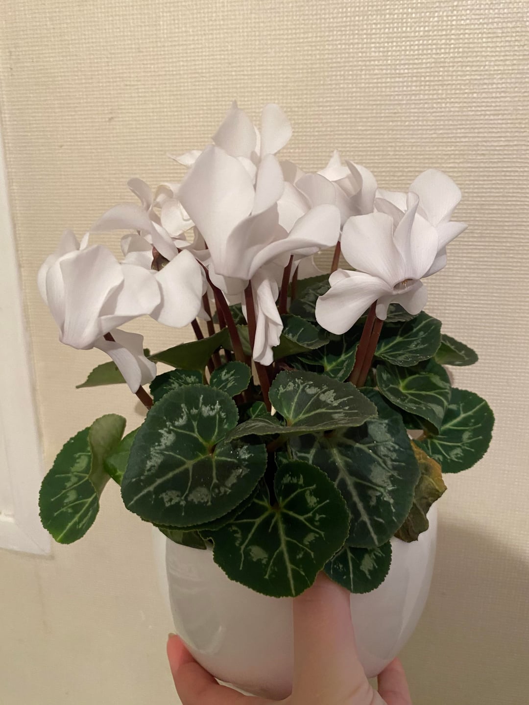 Cyclamen (existe aussi à fleurs violettes) AJA j’ai appris ça existe aussi à fleurs blanches.