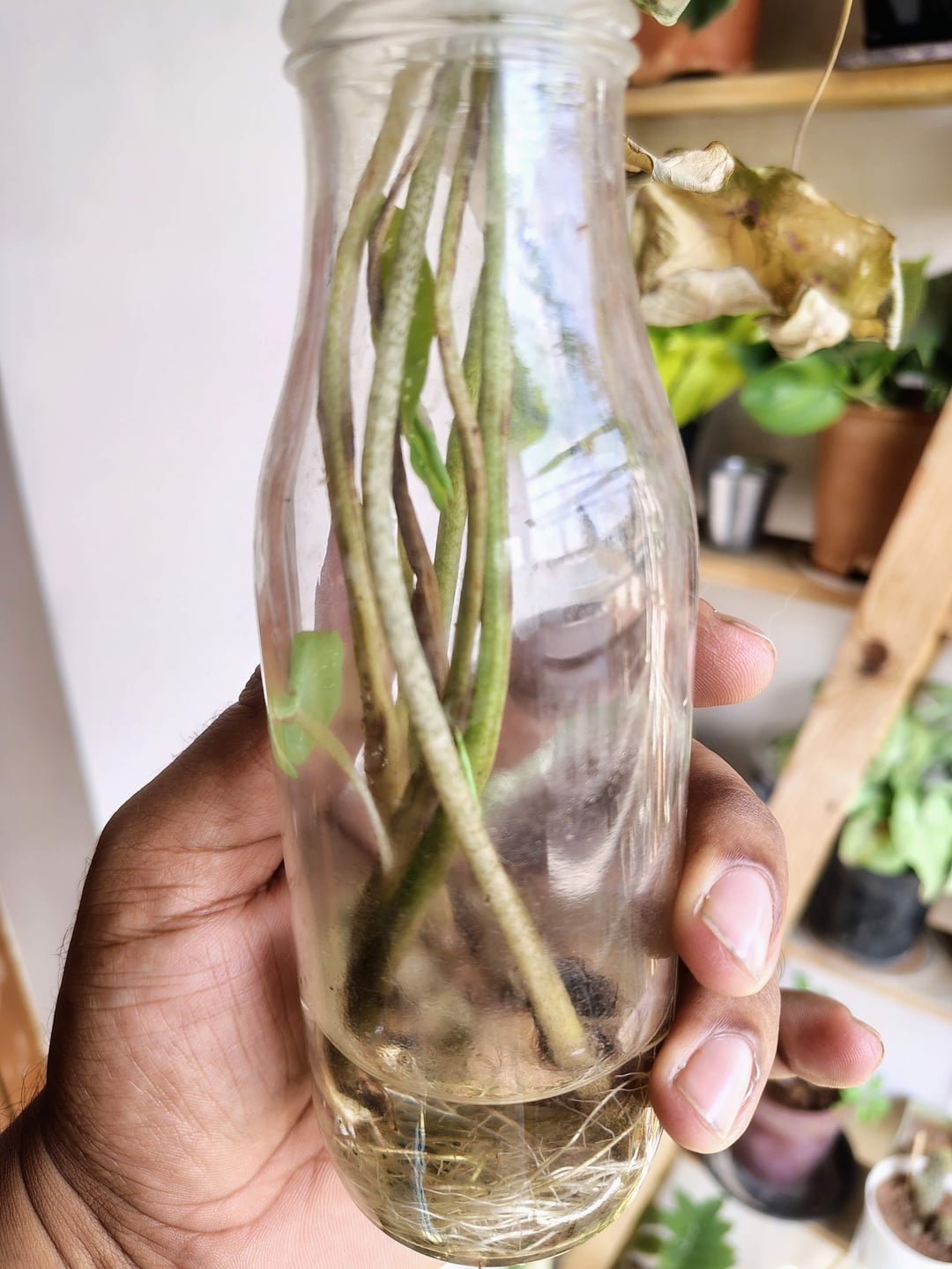 Letztlich vertraute ich der Natur und legte die Stängel ins Wasser, die Hälfte davon verwelkte (letztes Foto in diesem Beitrag) und diejenigen, an die ich ein wenig Vertrauen hatte, schlugen Wurzeln! Ich war etwas besorgt und erinnerte mich an die Zombie-Blatt-Kommentare.