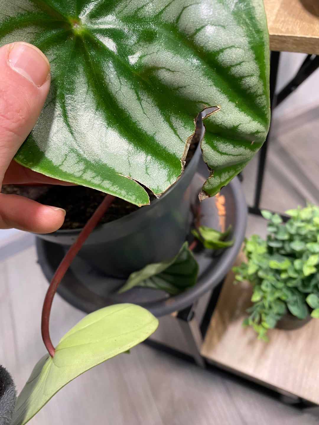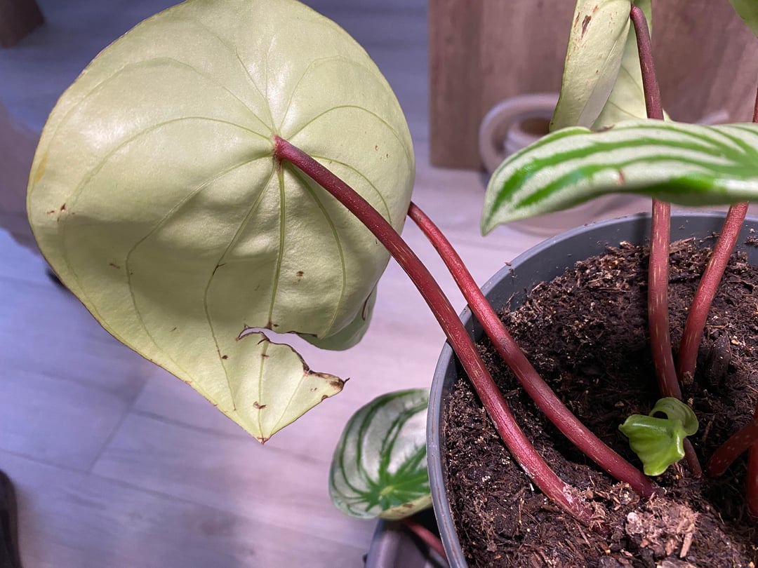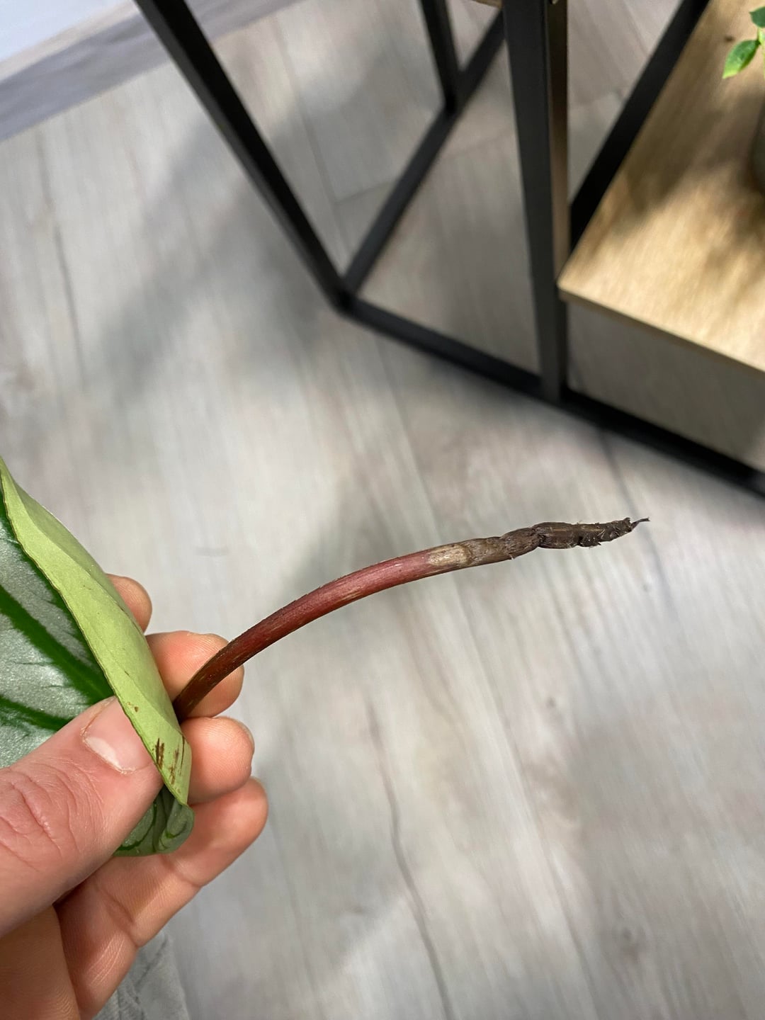 Zuerst ist mir aufgefallen das die leichten Schimmel Ansatz oberhalb der Erde hatte, daraufhin habe ich ihr neue Erde verpasst aber sie vorher gründlich gereinigt. Es schien erst das die Pflanze sich erholt weil schon neue Blätter wachsen, aber heute bei genaueren Hinsehen ist mir aufgefallen das die Stiele einfach abfallen. Zudem scheint das größere Blatt was ich fotografiert habe auch ein Problem aufzuweisen.