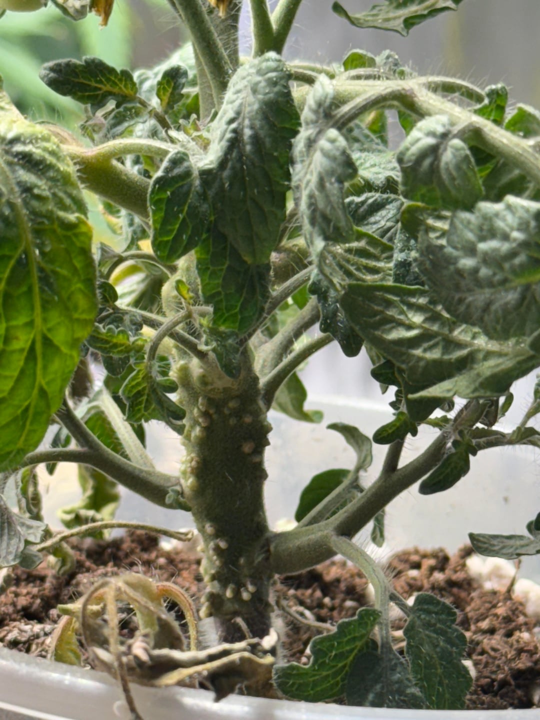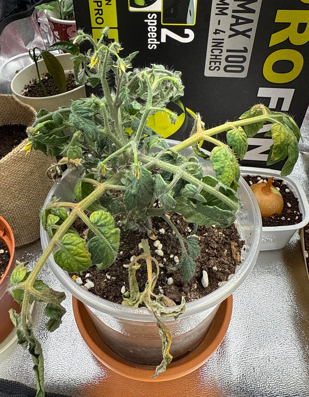 Hallo! Diese Tomatenpflanze ist 5 Wochen alt und beginnt zu blühen. Und genau das ist passiert: Die Blätter kräuseln sich und die unteren Blätter trocknen und fallen herunter.