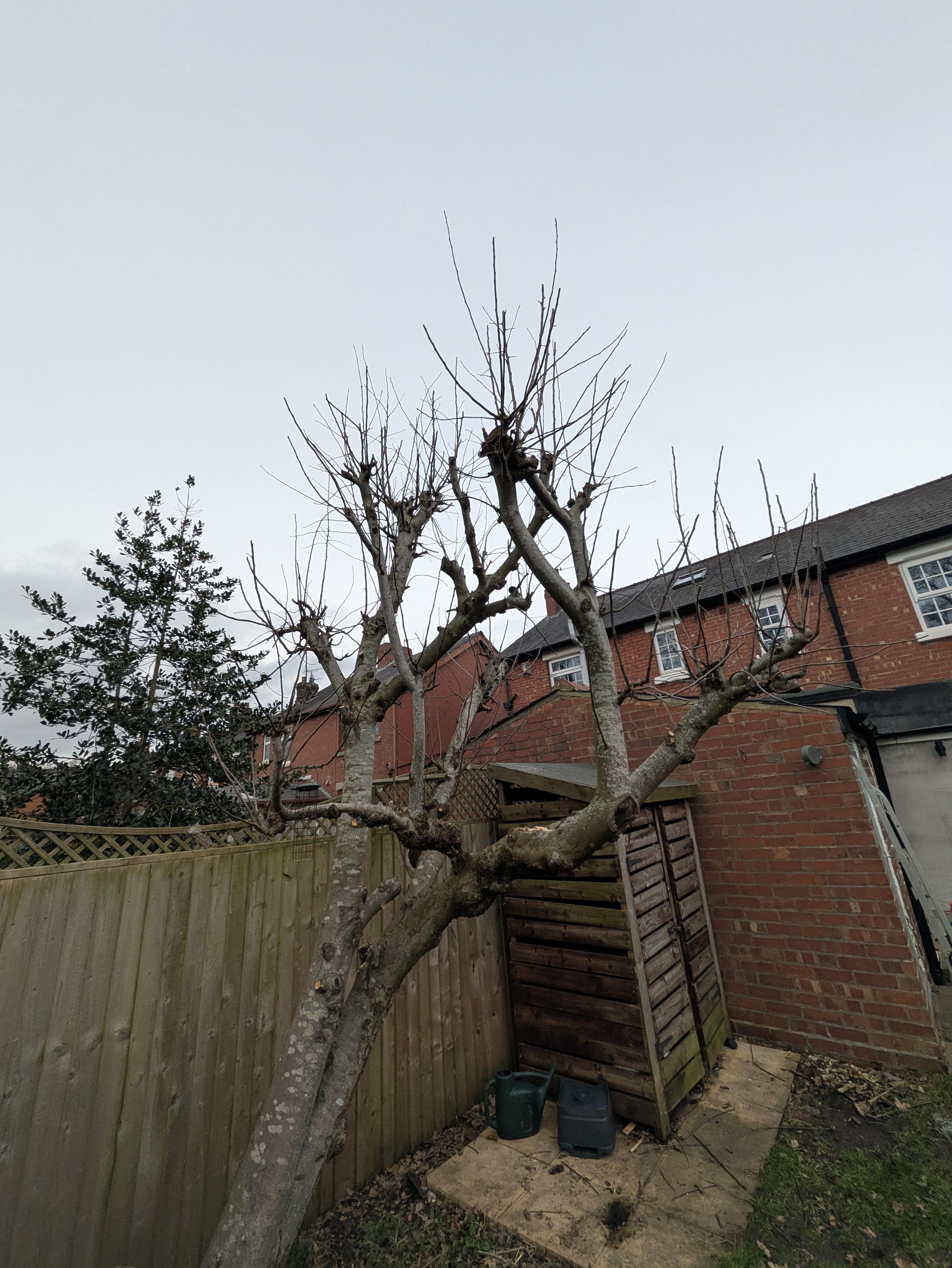 Ich habe begonnen, meinen Apfelbaum zu beschneiden. Vor ein paar Jahren habe ich einen Mann dafür bezahlt, und der Baum wurde komplett abgeschlachtet – er hat seitdem nicht mehr geblüht, aber letztes Jahr hat er ein paar Äpfel hervorgebracht, aber nichts Großes. Es war stark zugewachsen und ich wusste es damals nicht viel besser. Ich habe beschlossen, ihn dieses Jahr zu beschneiden, und das nach ein paar Stunden Arbeit. Ich habe Angst, dass ich es zu weit treibe und den Baum umwälze, denn ich möchte, dass er blüht, weil er hübsch ist. Eine gute Apfelernte wäre auch nicht schlecht.