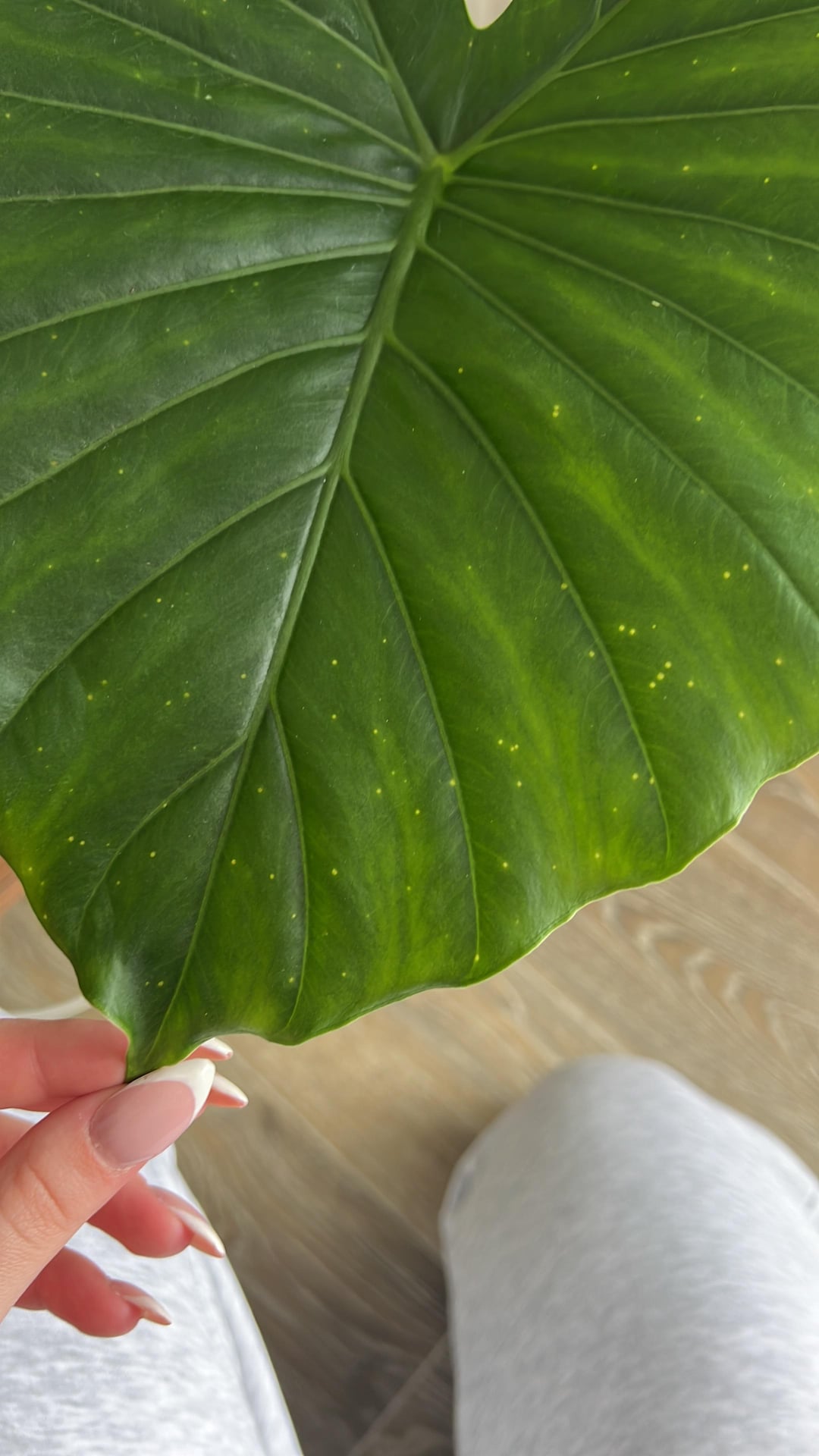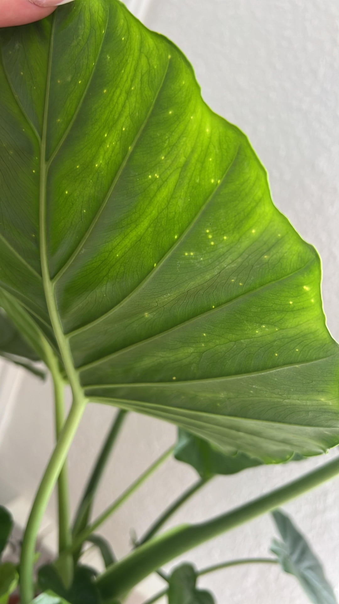 Hallo, ich habe mir diese Alocasia wentii vor 2 Tagen neu gekauft. Mir sind dann erst zuhause diese durchscheinenden Punkte aufgefallen.